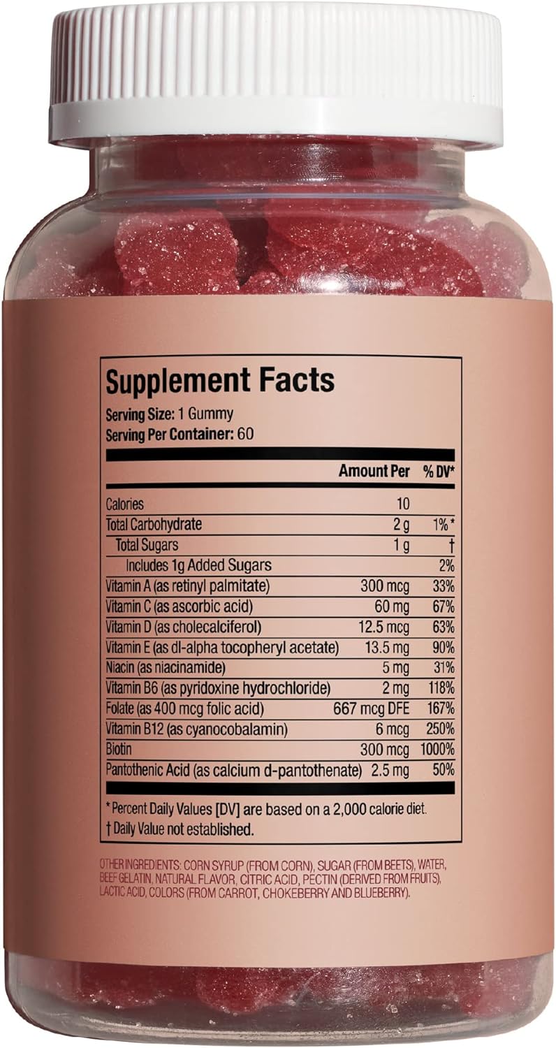 hims & hers biotin gummy vitamins support thick hair, strong nails, and healthy skin. Also contains key nutrients that are good for your heart, nerves, and digestionOur biotin gummies provide 300 mg of vitamin B7, an essential building block for healthy hair, in a delicious natural cherry flavor. We worked with doctors and a confectioner to make sure our vitamins deliver the right nutrients and taste greatBiotin is a water-soluble vitamin that is naturally available in many foods and multivitamins. Also called Vitamin B7 and Vitamin H, biotin helps your body break down carbohydrates, proteins, and fats into nutrientsFormulated with Vitamin B12, Vitamin B6, and Vitamin D to help ensure your body has the nutrients it needs to survive the daily grind, and look good doing it. Our biotin gummies are gluten-free and made with no artificial sweeteners or flavorsTake 1 biotin gummy per day to promote healthy hair, skin and nails in a yummy bite. Take only the recommended amount. hims & hers biotin gummies are not intended to treat hair loss, but they can deliver nutrients to support a healthy head of hairHIMS & HERS biotin Builder Gummy with Vitamins B12, B6 and D, Gluten Free, no Artificial sweeteners or Flavors, Wild Cherry , 60 Count