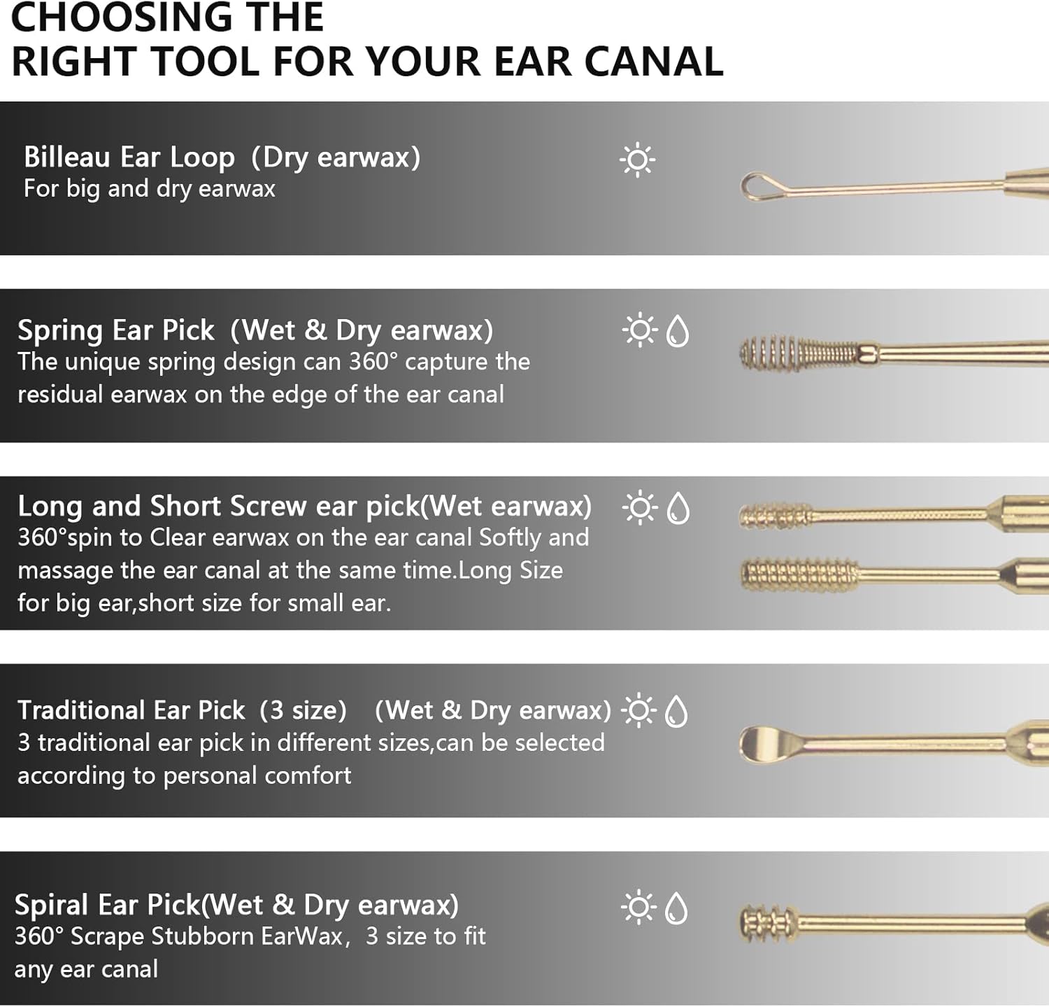 Professional Earwax Removal Tools Each Ear Pick Is Extended And Designed With Double-Head,And Different Ear Scoops Can Be Used Together To Remove Dry Or Oil Earwax Perfectly,Especially: Spring Ear Picker, Screw Ear Curette,And Spiral Ear Wax Remover Can Remove Adhesions In The Ear Canal 360°The Wet Earwax On The Inner Wall Massages The Ear Canal At The Same Time,And Billeau Ear Loop Can Easily Remove Larger Dry Earwax