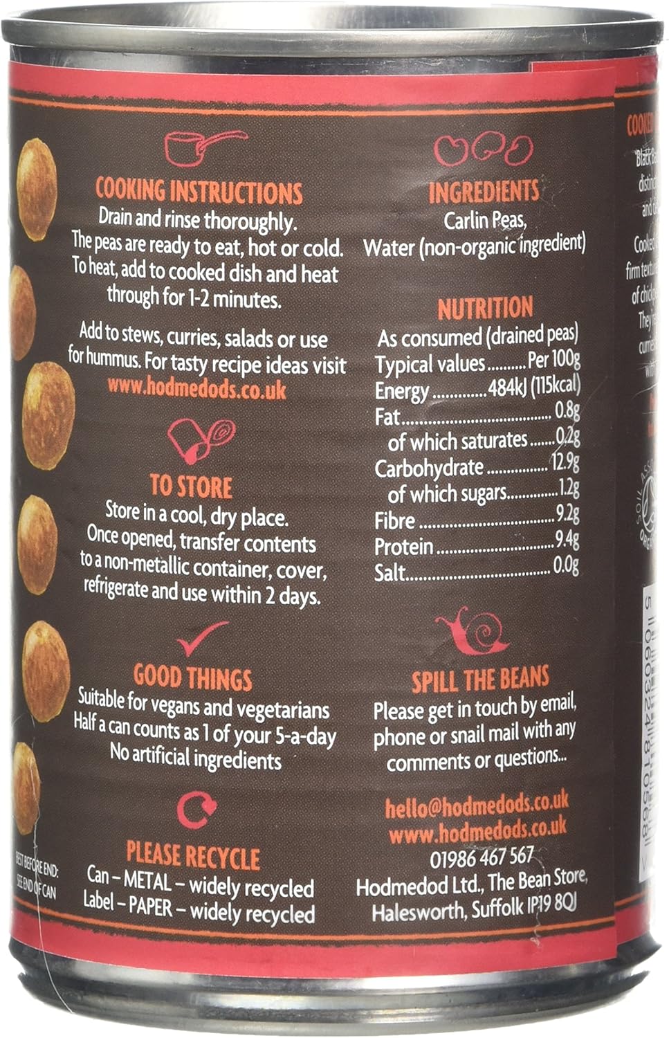 Product Description Canned "Black Badger" Carlin Peas, also know as Black or grey peas, are cooked and ready to use. Carlin Peas are popularly served as parched peas in Lancashire, simply boiled up and eaten with vinegar and salt. With their firm texture and delicious nutty flavour, Carlin peas make a good British substitute for chickpeas. Ingredients Carlin Peas, Water (non-organic ingredient) P.when('A').execute(function(A) { A.on('a:expander:toggle_description:toggle:collapse', function(data) { window.scroll(0, data.expander.$expander[0].offsetTop-100); }); }); Box Contains 1 x Hodmedods Carlin Peas In Water 400 g (Pack of 12) See more,Cooked and ready to use,Suitable to be boiled and eaten with vinegar and salt,Firm texture and nutty flavour,From Hodmedod's