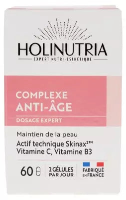 Holinutria Anti-Aging Complex 60 Capsules Is A Dietary Supplement Based On Red Vine, Superoxide Dismutase, Zinc And Vitamins. Vitamin C Contributes To Normal Collagen Formation To Ensure Normal Skin Function, And Helps Protect Cells Against Oxidative Stress. Vitamin B3 And Zinc Help Maintain Normal Skin. Vegan. Made In France