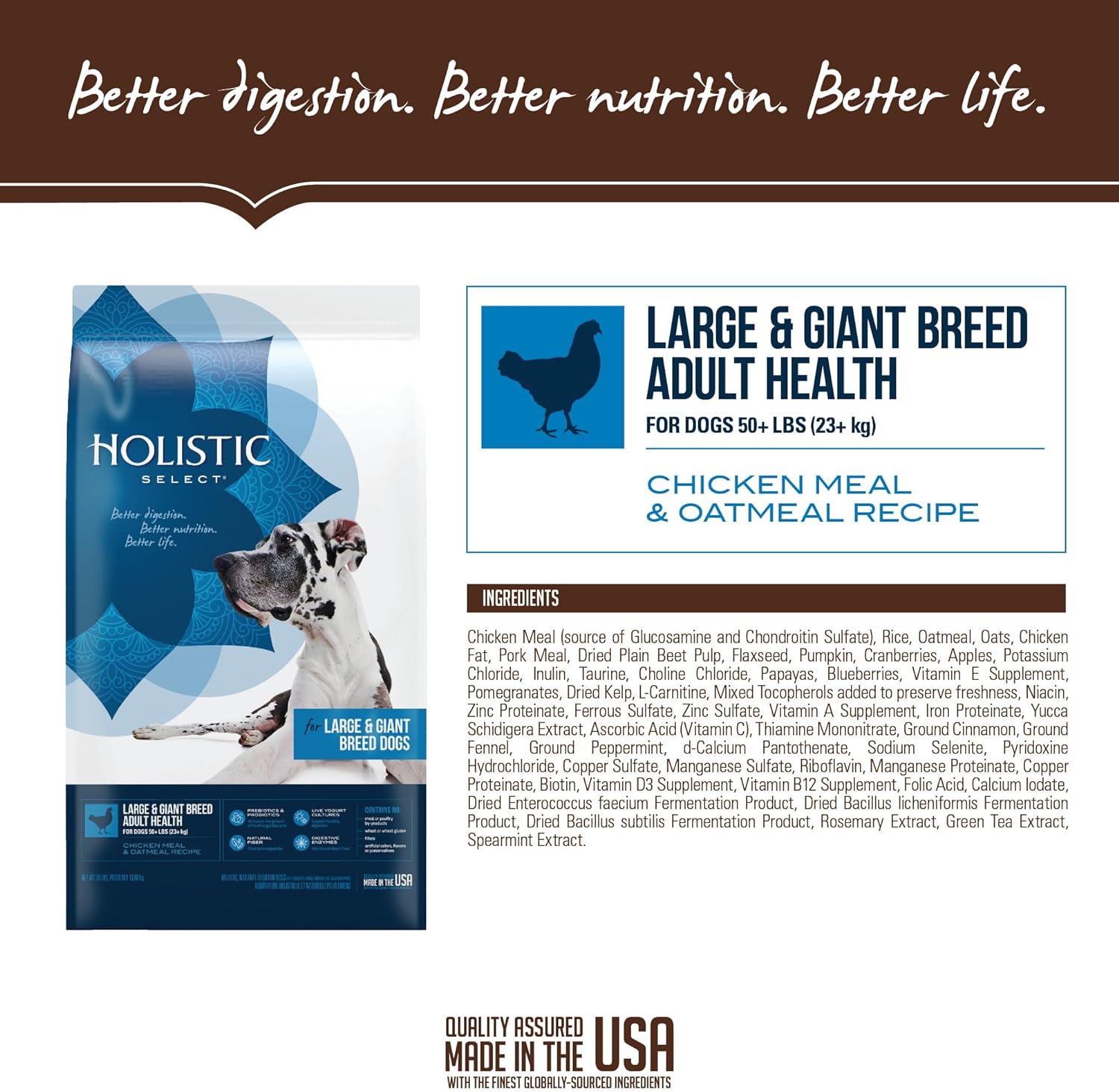 Holistic Select Natural Dry Dog Food Large & Giant Breed Chicken Meal & Oatmeal Recipe Is Specially Formulated Natural Dry Dog Food For Large Breed Dogs With Larger Kibble For Larger Mouths And Our Unique Digestive Health Support System, Including Active Probiotics, Healthy Fiber And Digestive Enzymes. When Combined With Our Other High Quality, Natural Ingredients, This Recipe Supports The Absorption And Utilization Of Vital Nutrients Throughout Your Dog’S Entire Body. Your Dog Will Look And Feel Healthy From The Inside Out