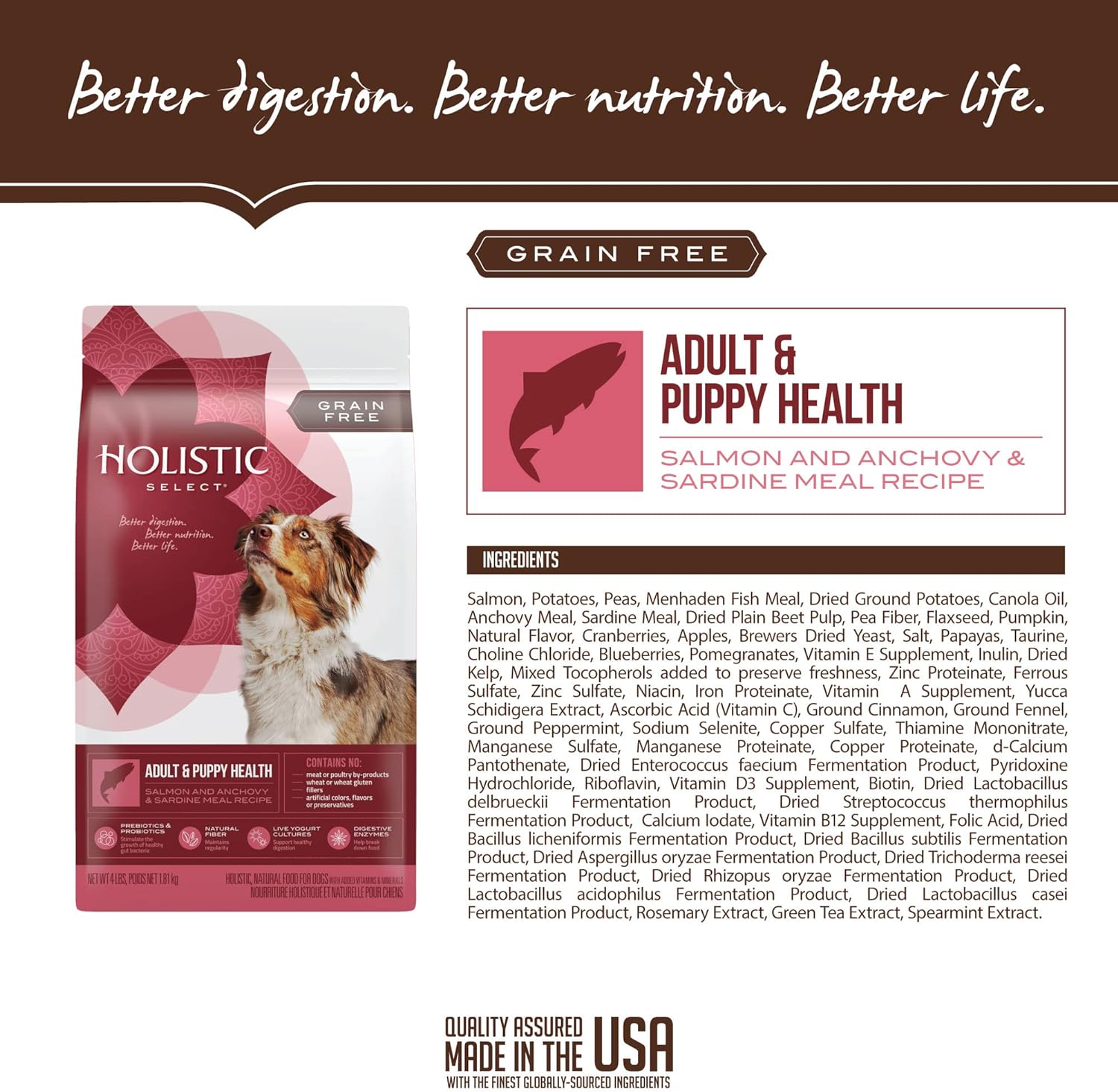 Holistic Select Natural Grain Free Dry Dog Food Adult & Puppy Health Salmon And Anchovy & Sardine Meal Recipe Is Dry Grain Free Dog Food Formulated With Our Unique Digestive Health Support System, Including Active Probiotics, Healthy Fiber And Digestive Enzymes. When Combined With Our Other High Quality, Natural Ingredients, This Recipe Supports The Absorption And Utilization Of Vital Nutrients Throughout Your Dog’S Entire Body. Your Dog Will Look And Feel Healthy From The Inside Out