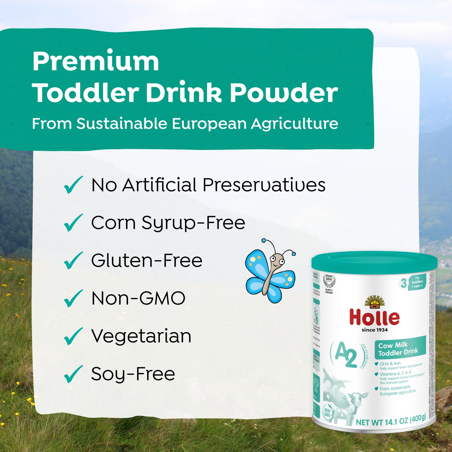 Non-GMO and Vitamin-Packed - This toddler milk powder is made with 100% A2 cow's milk that's gentle on your toddler's tummy, and contains vitamins A, C, D, and iron to help support healthy brain development and immune function10Convenient, Soy & Gluten Free - Our nutritious A2 cow's milk powder makes it easy to mix a non-GMO, vegetarian, soy, and gluten-free toddler drink on the go — no refrigeration required10Easy to Digest - One of the benefits of Holle Cow Milk Toddler Drink (A2) is that it can be easier for some children to digest. Plus, it also provides essential fatty acids like DHA, ARA, and Omegas 3 and 610Great Tasting & Easy to Mix - Unlike other toddler drinks, our recipe contains no artificial preservatives, corn syrup, or other unnatural ingredients. To mix, use the enclosed scoop to combine one scoop of powder for every one fl ounce of water in a bottle, then shake well10Commitment To Quality - Holle uses only high quality ingredients and we bear a special responsibility for the environment, children, and their future. We promote a holistic, sustainable toddler nutritional drink based on simple recipes without chemical processing or use of preservatives, artificial flavors or colors, added salt or granulated sugar