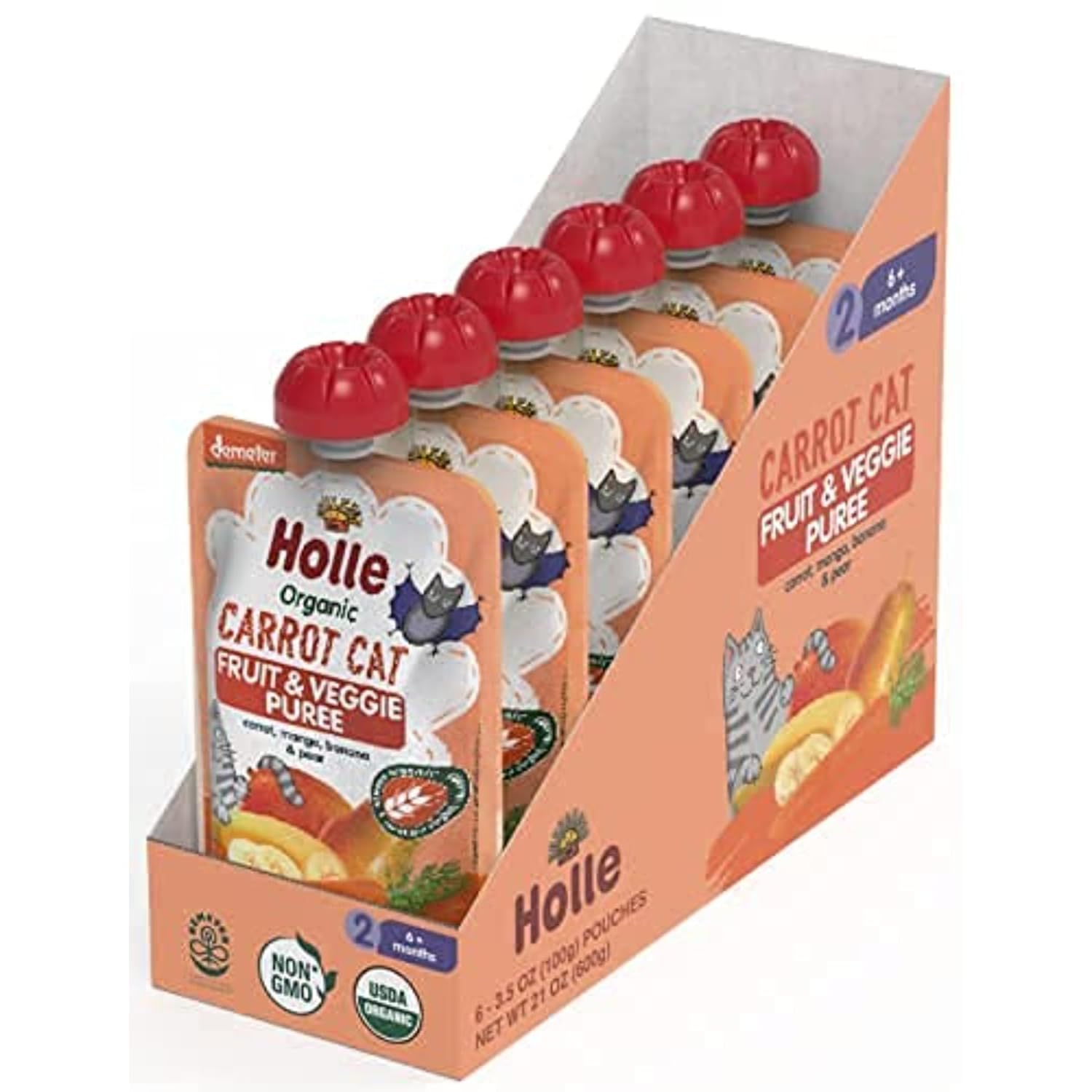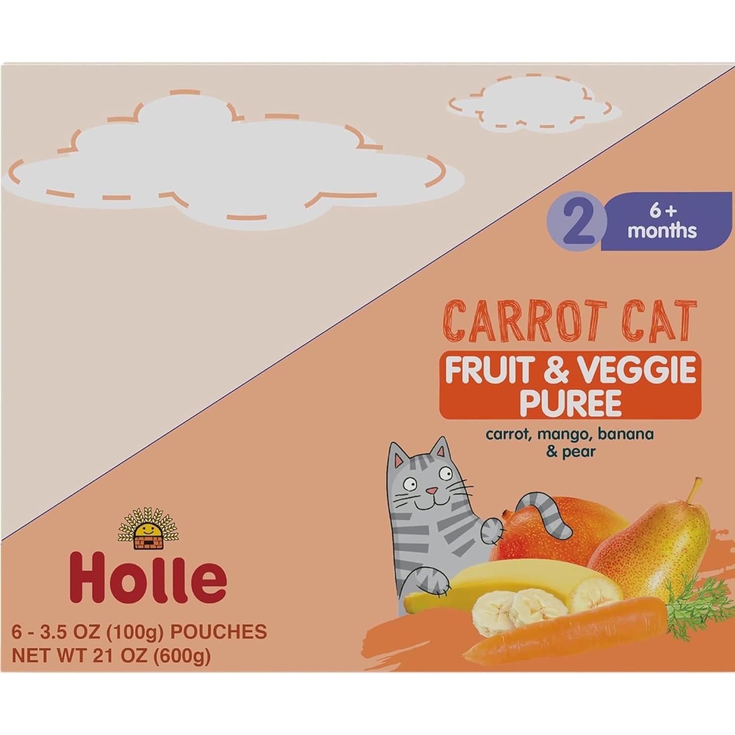 Holle Organic Baby Food Pouches - Carrot Cat Baby Puree with Carrot, Mango, Banana & Pear - (6 Pack) Organic Baby Snacks + Fruit and Veggie Pouches for Weaning Babies 6 Months and Older