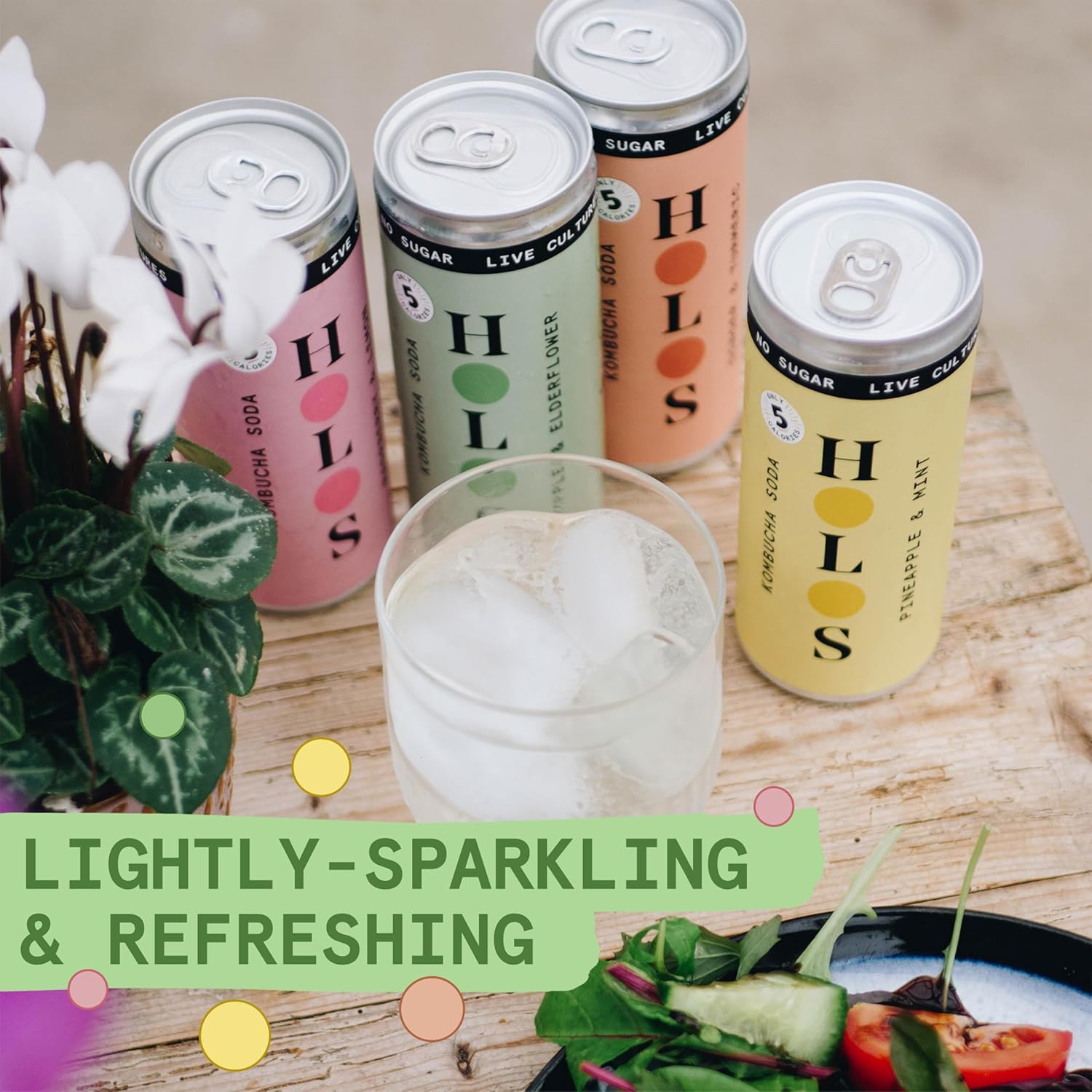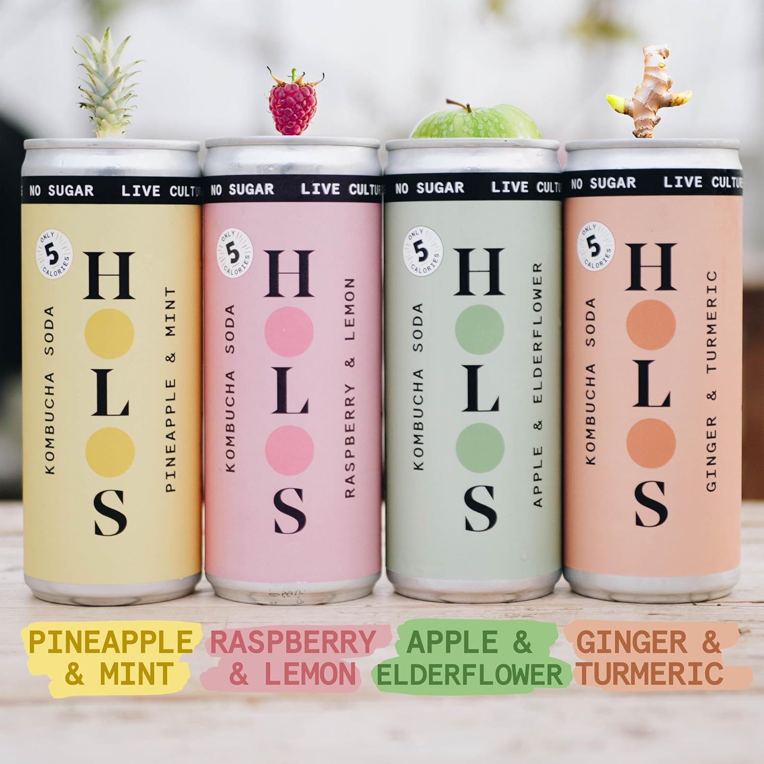 Holos Mixed Case Sparkling Kombucha Soda - 3X Each Raspberry & Lemon, Apple & Elderflower, Ginger & Turmeric, Pineapple & Mint - Sugar Free Gluten Free Live Culture Drink - 12 X 250Ml Kombucha Cans