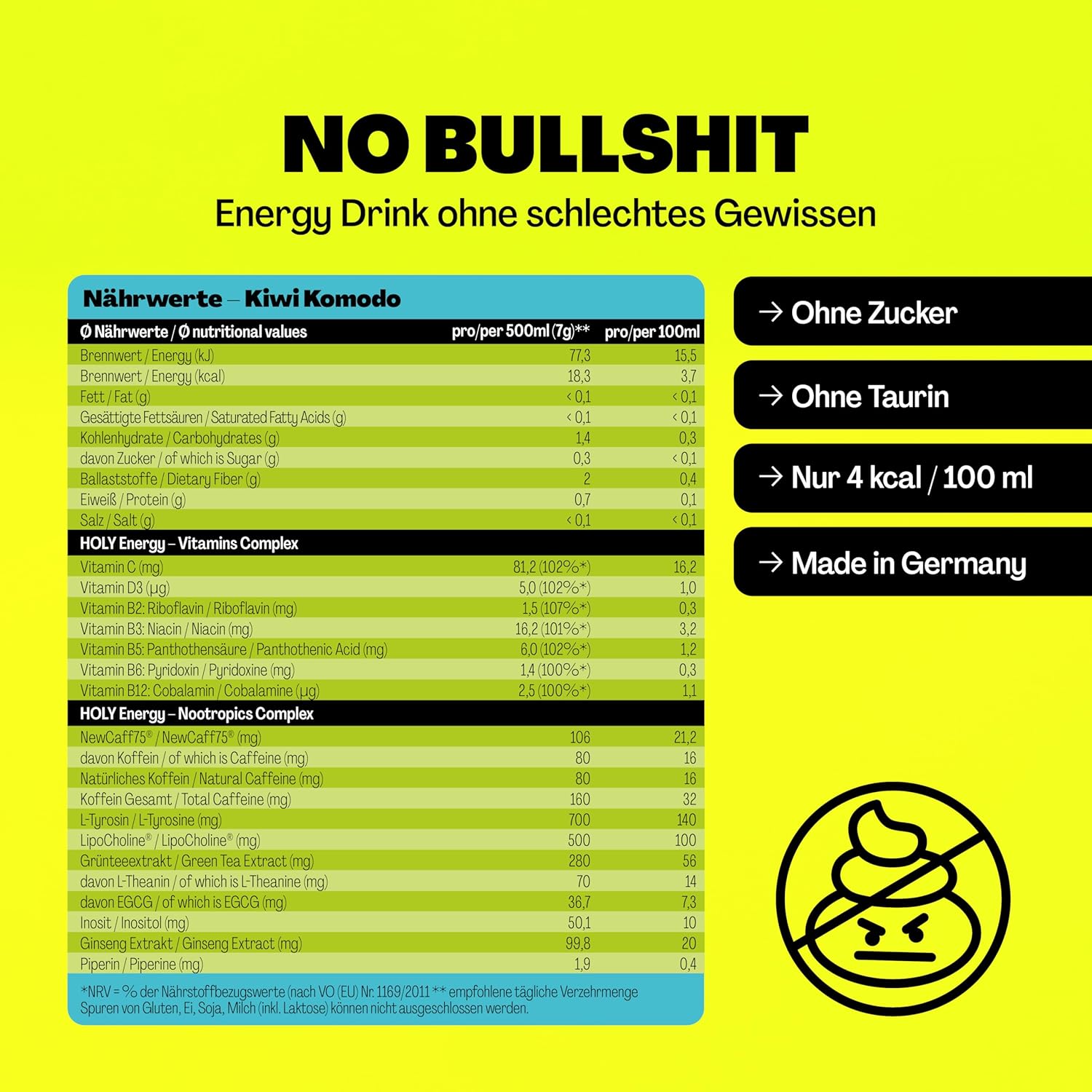 ?? 100% natural flavours - no artificial additives, no sugar, no taurine. HOLY Energy uses only natural flavours and colours, is vegan and sustainably produced. So you can enjoy your energy boost without a guilty conscience