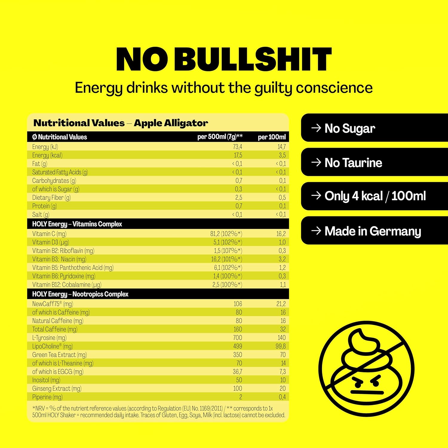 ? NO BULLSHIT - Only the best ingredients go into our energy drink: No taurine, no sugar, 100% natural flavors, sustainable and vegan!