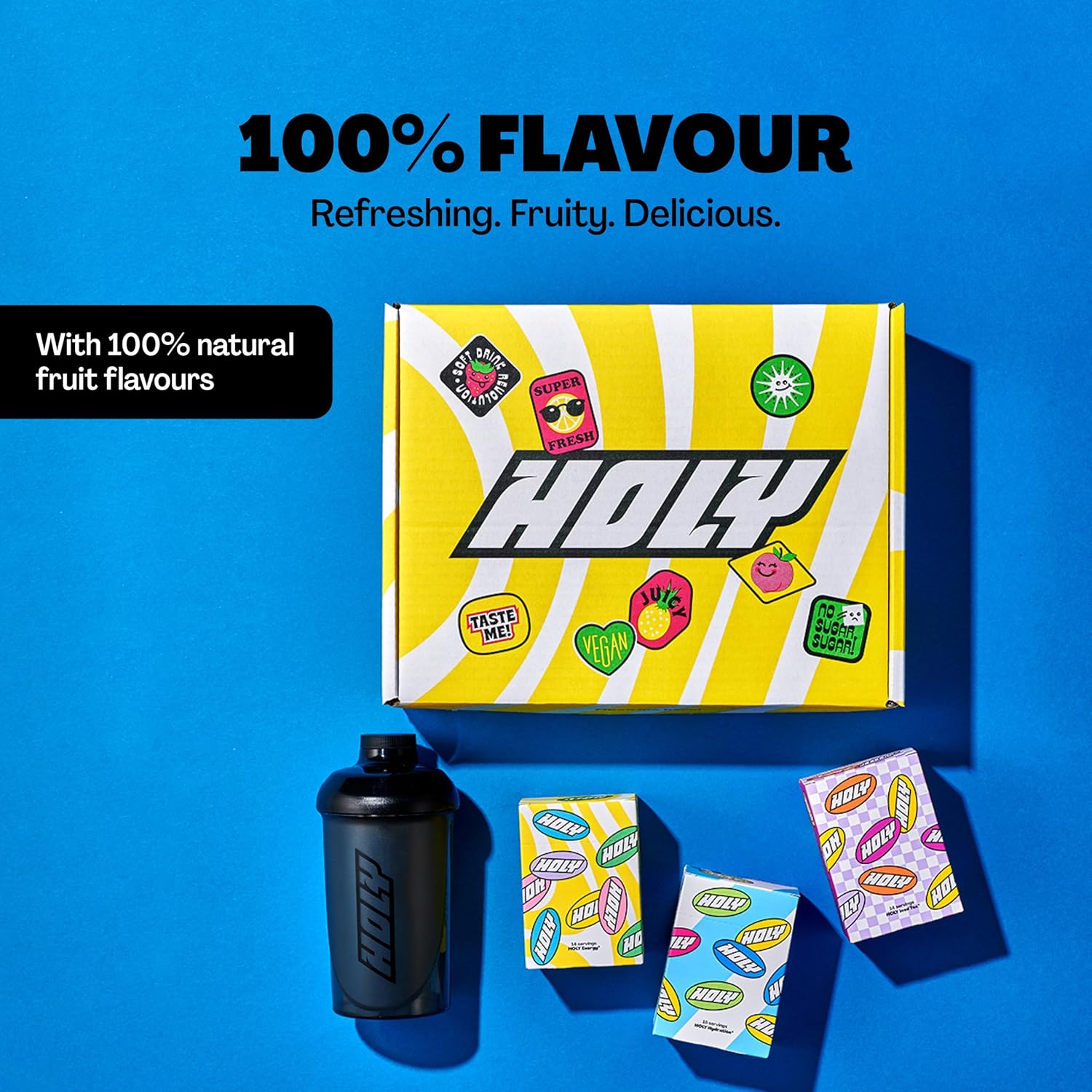 About this item ?? ?????????????? - With HOLY you get a fruity, delicious taste with 100% natural flavours & colours. No bulk β Our soft drinks set new standards in terms of quality: no sugar, no taurine and only high-quality ingredients. HOLY strengthens you with antioxidants and vitamins - sustainable and vegan! Good for you: Our soft drinks are your faithful companion for every situation: whether you need focus, refreshment or quick hydration after sports. ?? Affordable and practical β our powder is delivered to your home in an instant, and available from 80 cents per 0.5 litre drink Good for the planet β with Holy, you save 90%+ packaging waste and a lot of CO2. Mother Earth says thank you! βΊ See more product details,?? ?????????????? - With HOLY you get a fruity, delicious taste with 100% natural flavours & colours,No bulk β Our soft drinks set new standards in terms of quality: no sugar, no taurine and only high-quality ingredients. HOLY strengthens you with antioxidants and vitamins - sustainable and vegan!,Good for you: Our soft drinks are your faithful companion for every situation: whether you need focus, refreshment or quick hydration after sports,?? Affordable and practical β our powder is delivered to your home in an instant, and available from 80 cents per 0.5 litre drink,Good for the planet β with Holy, you save 90%+ packaging waste and a lot of CO2. Mother Earth says thank you!