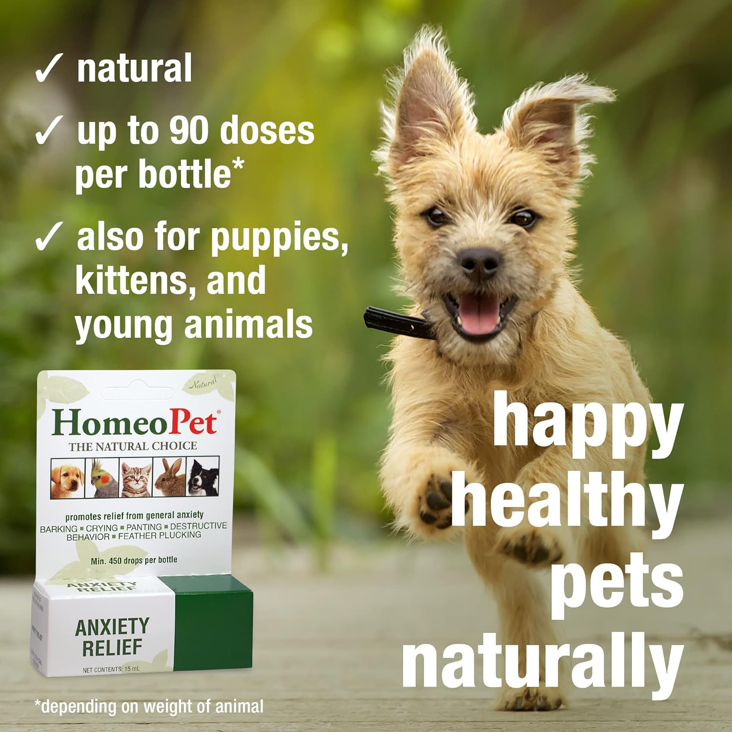 About this item ANXIETY RELIEF FOR DOGS & CATS: HomeoPet Anxiety Relief medicine can promote relief from fear and anxiety related to separation, kenneling, vet and grooming visits, and other stressful situations. It is a safe and natural aid for anxious pets. SAFE INGREDIENTS: Made from natural ingredients, this safe and gentle anxiety help for dogs, cats, and other pets can be used for animals to help treat anxiety as signaled by restlessness, whining, crying, or feather plucking in birds. EASY TO USE: Our pet calming treatment is easy to use. Give orally 3 times a day until symptoms improve. For acute cases, give every 15 minutes for up to 4 doses. When symptoms improve, reduce dosing, then discontinue use. FOR PETS OF ALL AGES: HomeoPetās calming aid for dogs and cats is well tolerated, safe, gentle, and natural with no known side effects. It can be used on dogs and cats of all ages and can even be used on birds, rabbits, and other animals. SIMPLE, SAFE & PURE: Daniel H. Farrington and his veterinarian brother, Thomas Farrington, created HomeoPet to bring high-quality, safe, natural, and affordable treatments and supplements to pets and pet parents worldwide. See more product details,ANXIETY RELIEF FOR DOGS & CATS: HomeoPet Anxiety Relief medicine can promote relief from fear and anxiety related to separation, kenneling, vet and grooming visits, and other stressful situations. It is a safe and natural aid for anxious pets,SAFE INGREDIENTS: Made from natural ingredients, this safe and gentle anxiety help for dogs, cats, and other pets can be used for animals to help treat anxiety as signaled by restlessness, whining, crying, or feather plucking in birds,EASY TO USE: Our pet calming treatment is easy to use. Give orally 3 times a day until symptoms improve. For acute cases, give every 15 minutes for up to 4 doses. When symptoms improve, reduce dosing, then discontinue use,FOR PETS OF ALL AGES: HomeoPetās calming aid for dogs and cats is well tolerated, safe, gentle, and natural with no known side effects. It can be used on dogs and cats of all ages and can even be used on birds, rabbits, and other animals,SIMPLE, SAFE & PURE: Daniel H. Farrington and his veterinarian brother, Thomas Farrington, created HomeoPet to bring high-quality, safe, natural, and affordable treatments and supplements to pets and pet parents worldwide
