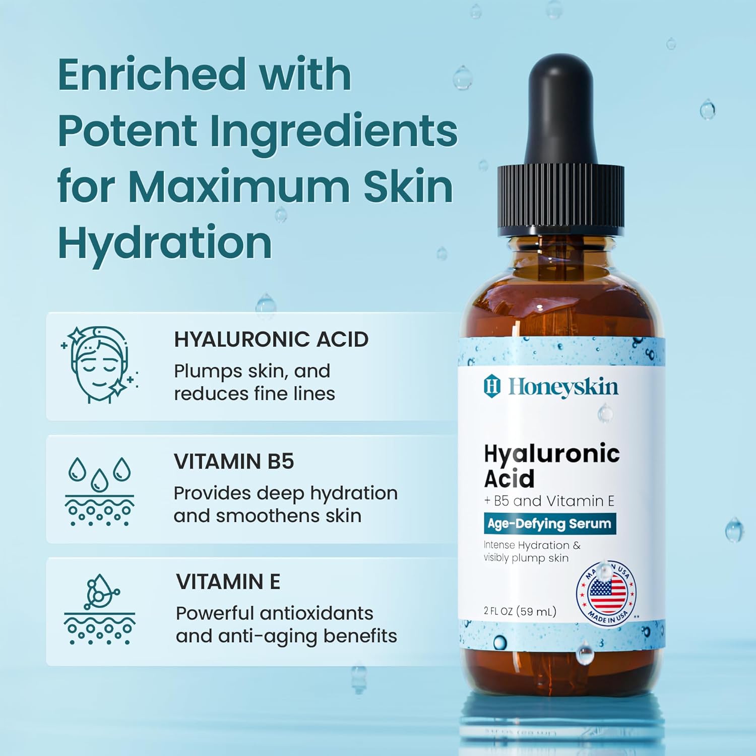 Honeyskin - Hyaluronic Acid Serum For Face With Vitamin E Oil For Skin - Anti-Aging And Hydrating Face, Hydration Moisturizer With B5 - Non-Greasy, Paraben Free, Wrinkle Reducing Serum - (2Oz)