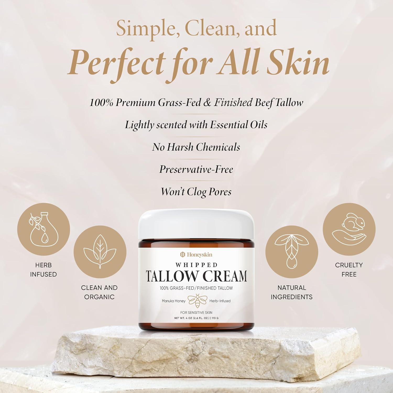 Honeyskin Whipped Tallow And Honey Cream – 100% Grass-Fed All Natural Mountain Beef Tallow For Skin Face Moisturizer – Nourishing, Hydrating Cream For Dry, Sensitive Skin – Gentle Soothing Care, 4Oz