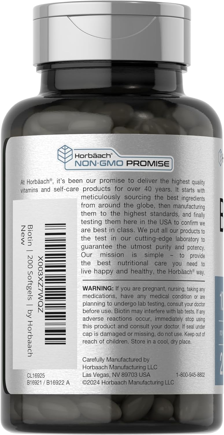 Horbaach Biotin 10000 Mcg | 200 Softgels | Vitamin B7 Supplement | Non-Gmo & Gluten Free