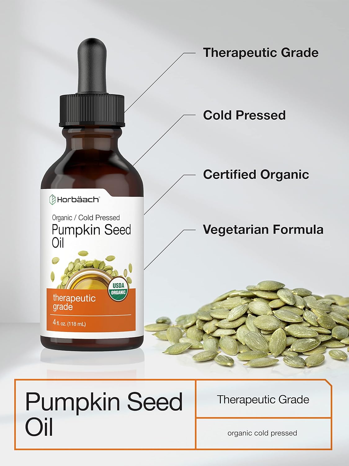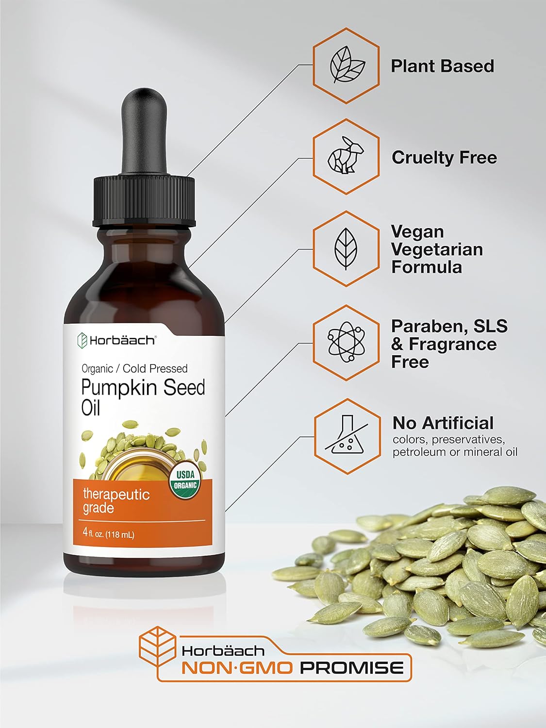 Horbäach Organic Pumpkin Seed Oil | 4 Fl Oz | Cold Pressed, 100% Pure, Extra Virgin | Vegetarian, Non-Gmo, Gluten Free Formula | Great For Hair And Face
