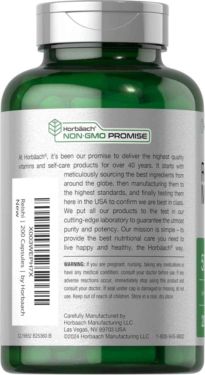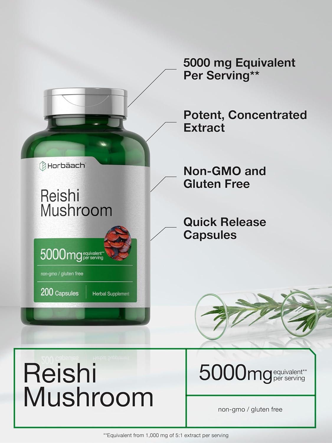 Horbäach Reishi Mushroom Capsules | 5000Mg | 200 Count | Non-Gmo And Gluten Free Extract Supplement