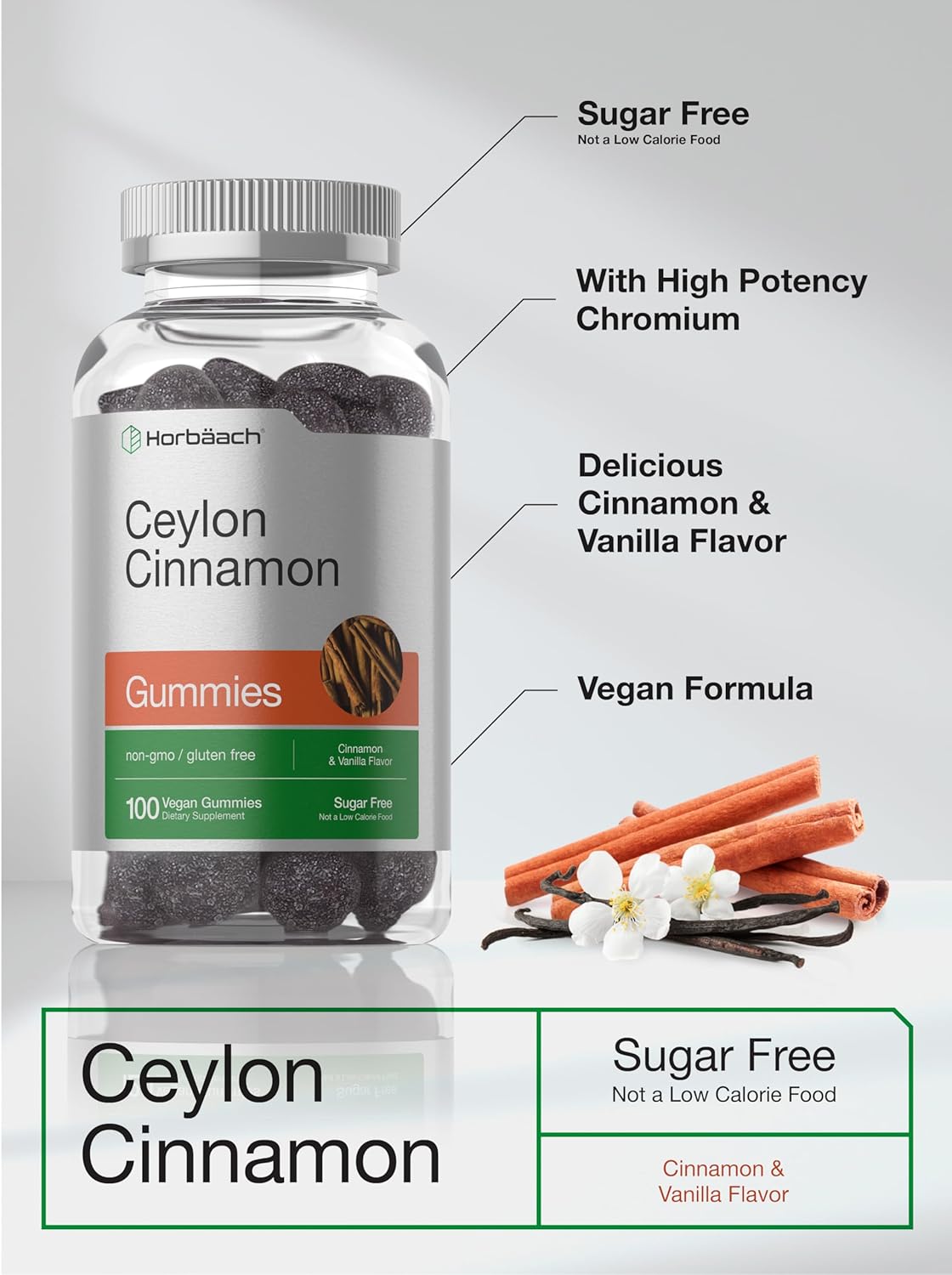 Horbaach Sugar Free Ceylon Cinnamon Gummies 2000Mg | 100 Count | Vegan, Non-Gmo, Gluten Free | Cinnamon & Vanilla Flavor