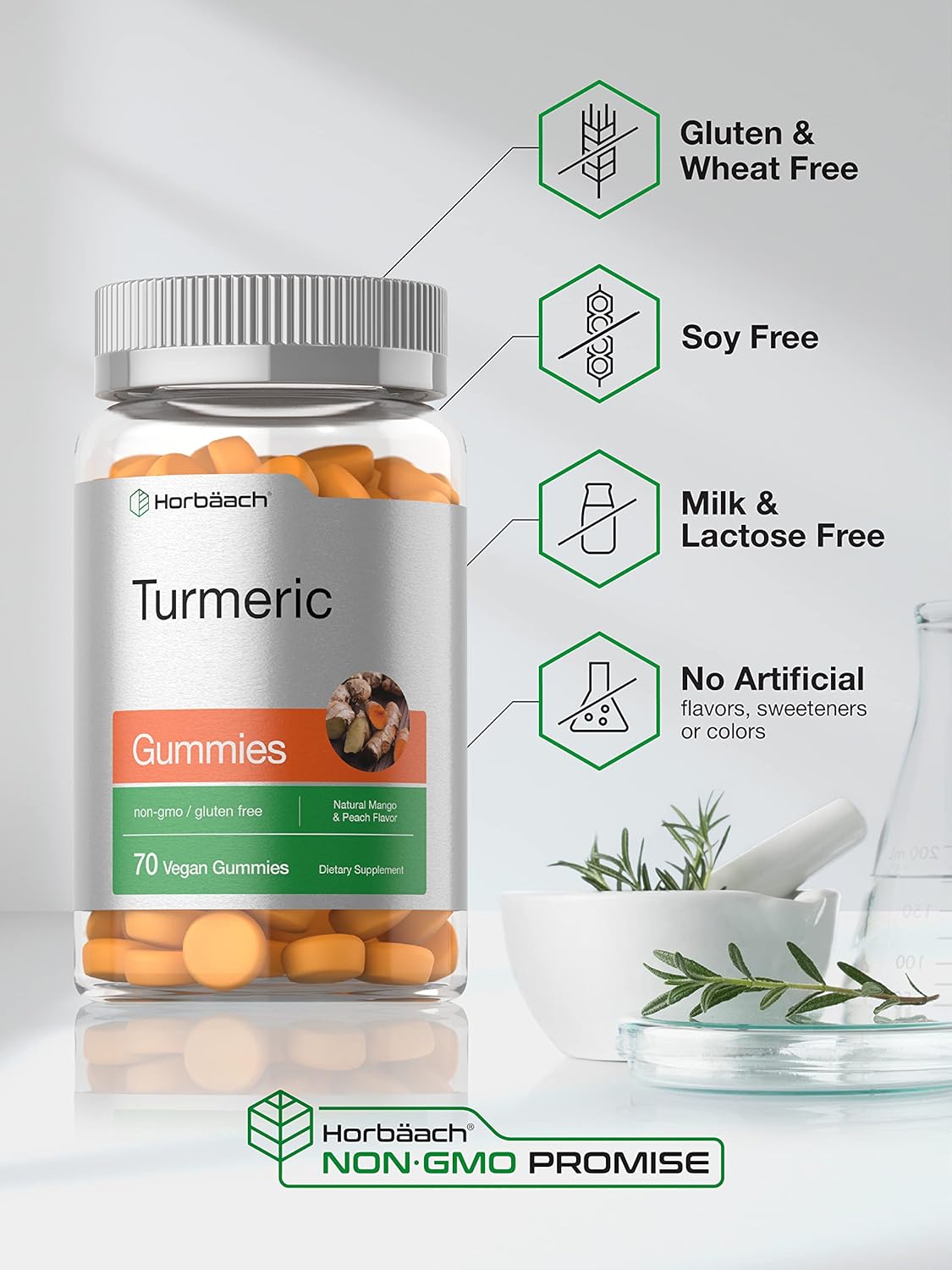 Horbäach Turmeric Curcumin Gummies | 70 Count | Mango & Peach Flavor | Turmeric And Ginger Root Gummy Supplement | Vegan, Non-Gmo & Gluten Free