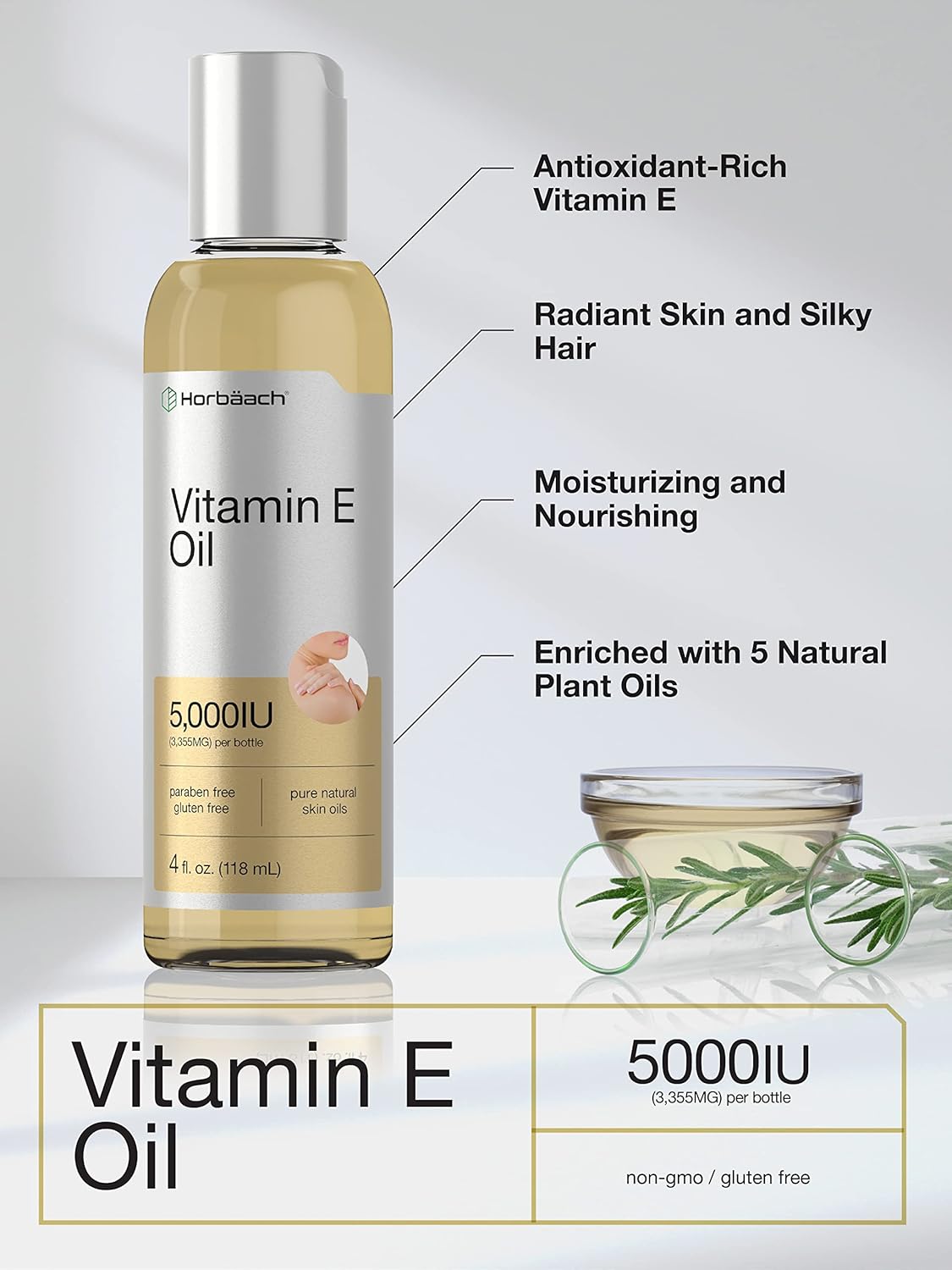 Horbäach Vitamin E Oil | 5000 Iu | 8 Oz (2 X 4Oz) Value Pack | For Skin, Hair, Face & Body | Vegetarian, Non-Gmo, And Gluten Free Formula