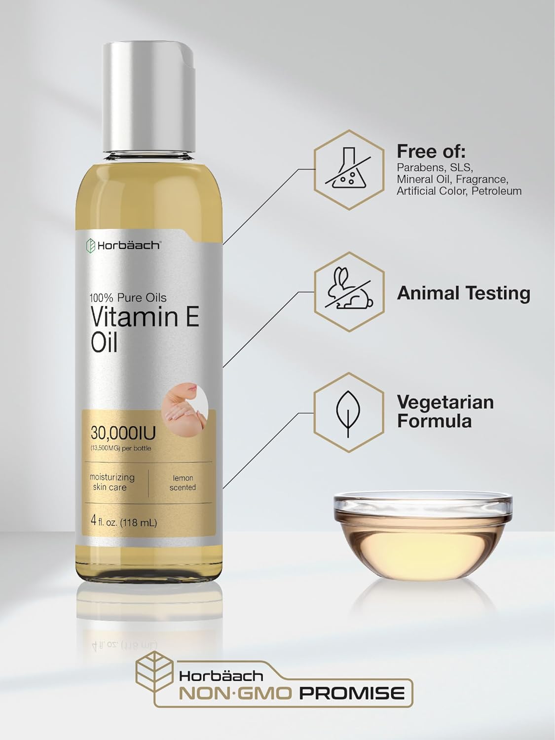 Horbäach Vitamin E Oil For Skin 30,000 Iu | 4 Fl Oz | 100% Pure Oils | Moisturizing Oil | Non-Gmo, Vegetarian | Lemon Scented