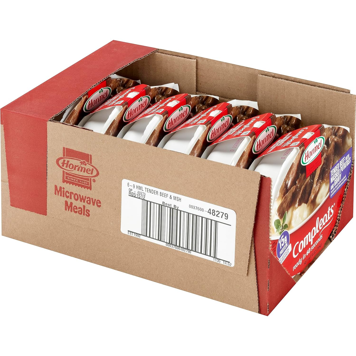 BULLET POINTS  :   1 >  Six 9 oz. microwave trays of HORMEL COMPLEATS Tender Beef With Mashed Potatoes & Gravy is comfort food ready in 60 seconds – it’s America’s shelf stable tray