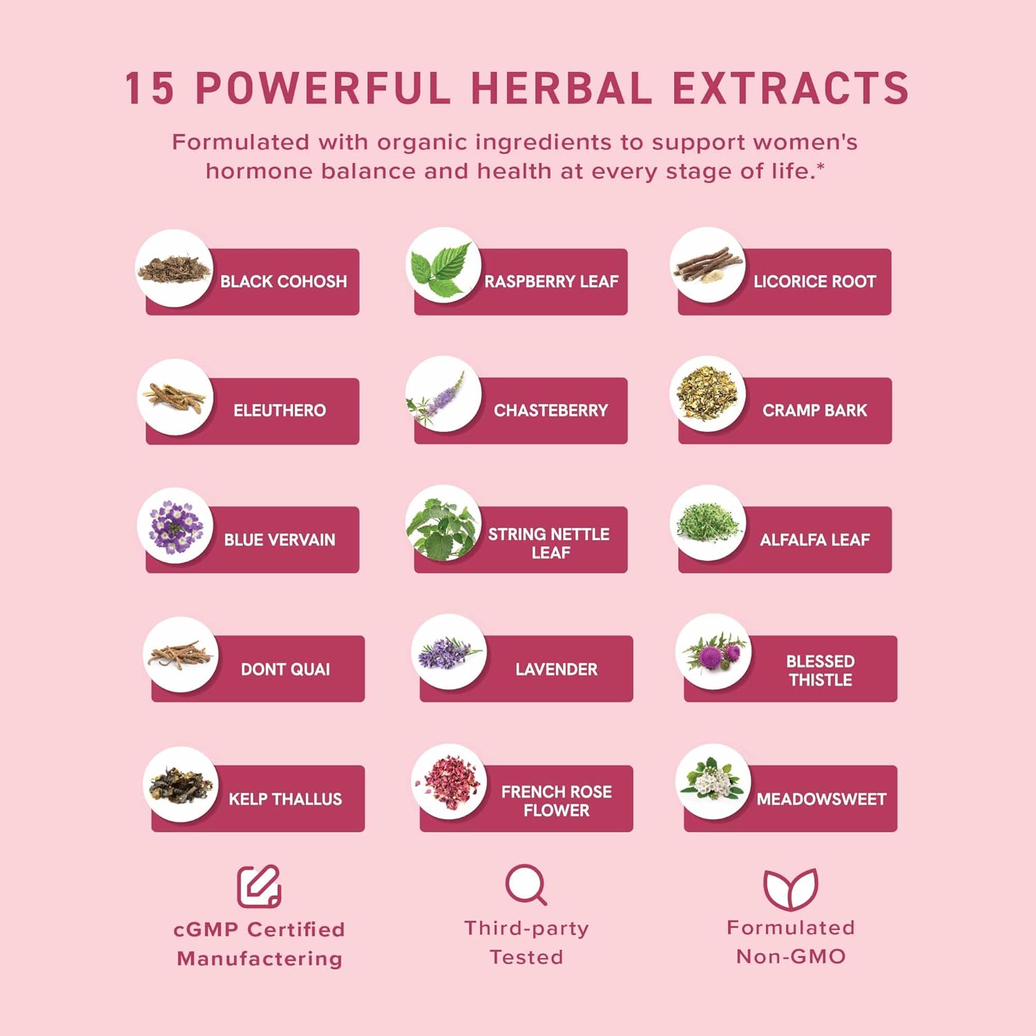 Organic Liquid Extracts: The Organic Herbal Extract Blend In This Hormone Balance Supplement Tincture Includes Stinging Nettle Leaf, Red Raspberry, Eleuthero, Dong Quai, Licorice, Meadowsweet, French Rose, Black Cohosh, Chasteberry, Cramp Bark, Lavender, Blue Vervain And More