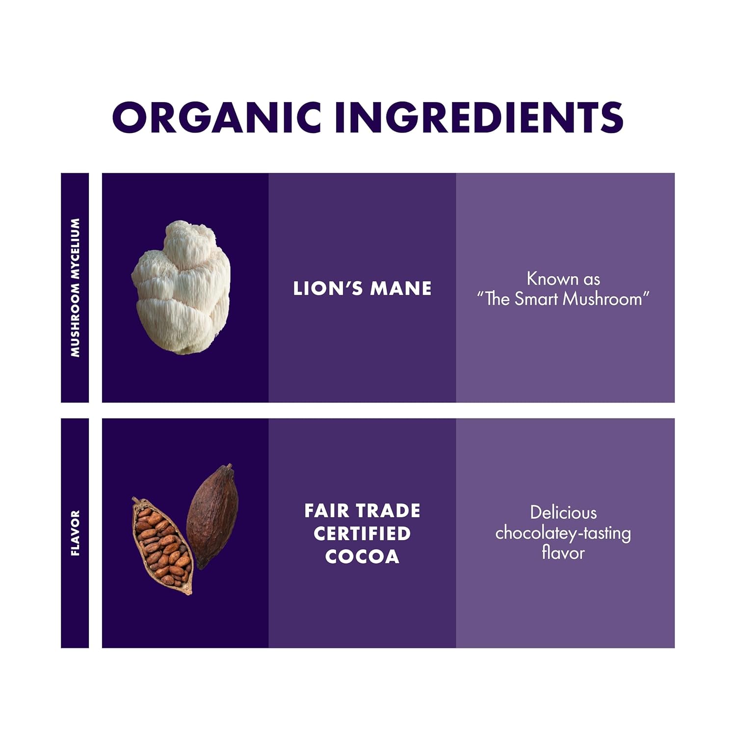 Cocoa Powder with Mushrooms: This powder drink mix is delicious, chocolatey, and easy to mix; this Lion's Mane cocoa drink mix is formulated with Fair Trade Certified cocoa and coconut sugar