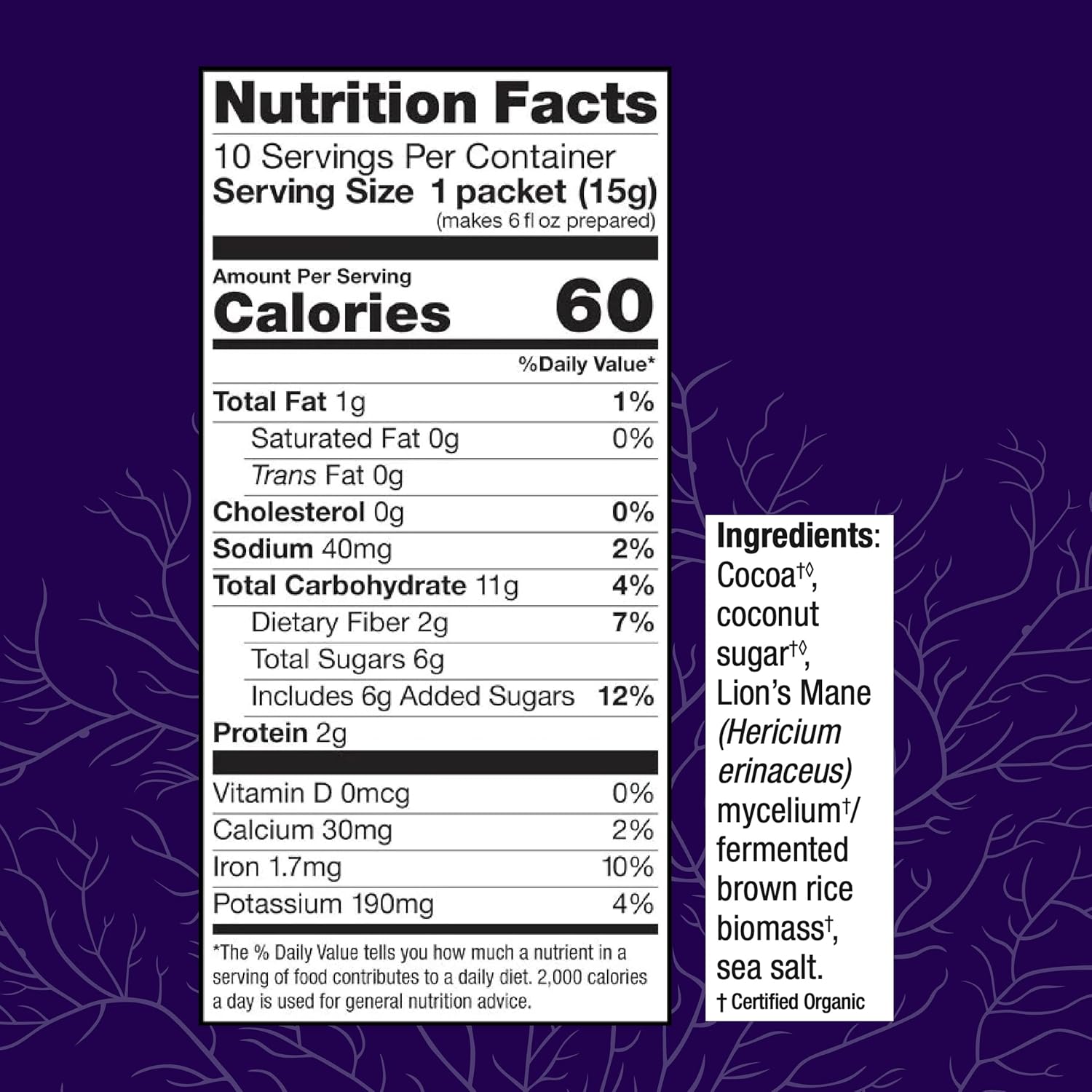 About this item Cocoa Powder with Mushrooms: This powder drink mix is delicious, chocolatey, and easy to mix; this Lion's Mane cocoa drink mix is formulated with Fair Trade Certified cocoa and coconut sugar Lion's Mane Mushroom Drink: Our drink powder is elevated with Lion's Mane, "The Smart Mushroom," and is formulated with clean and organic ingredients About Host Defense: Host Defense Mushrooms was founded by renowned mycologist Paul Stamets; our mushroom mycelium is certified organic, non-GMO, gluten-free, and grown in the USA* Powered by Mushroom Mycelium: Our organic mushroom mycelium is grown on organic brown rice substrate; third-party studies show that mushroom mycelium and fermented rice substrate support your health* Mushroom Powder Drink Mix: Add one drink packet (or one rounded tablespoon) to 6oz of hot liquid—try water, milk, or milk substitute—and stir to blend; for a refreshing alternative, dissolve in hot liquid, then stir, shake, or blend with ice  See more product details,Cocoa Powder with Mushrooms: This powder drink mix is delicious, chocolatey, and easy to mix; this Lion's Mane cocoa drink mix is formulated with Fair Trade Certified cocoa and coconut sugar,Lion's Mane Mushroom Drink: Our drink powder is elevated with Lion's Mane, "The Smart Mushroom," and is formulated with clean and organic ingredients,About Host Defense: Host Defense Mushrooms was founded by renowned mycologist Paul Stamets; our mushroom mycelium is certified organic, non-GMO, gluten-free, and grown in the USA,Powered by Mushroom Mycelium: Our organic mushroom mycelium is grown on organic brown rice substrate; third-party studies show that mushroom mycelium and fermented rice substrate support your health,Mushroom Powder Drink Mix: Add one drink packet (or one rounded tablespoon) to 6oz of hot liquid—try water, milk, or milk substitute—and stir to blend; for a refreshing alternative, dissolve in hot liquid, then stir, shake, or blend with ice