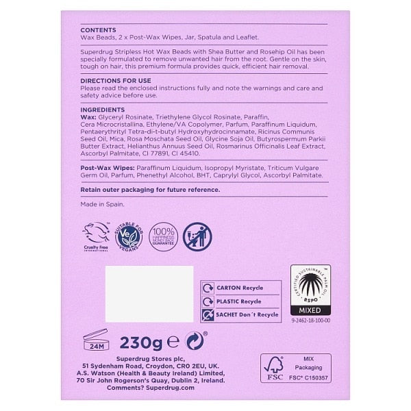 Stripless Hot Wax Beads With Shea Butter And Rosehip Oil Specially Formulated To Remove Unwanted Hair From The Root. Gentle On Skin, Tough On Hair, This Premium Formula Provides Quickly And Effective Hair Removal. Suitable For Sensitive Skin. Helps Leave Skin Feeling Smooth. The Post-Wax Wipes With Wheat Germ Oil Help Leave Skin Feeling Moisturised And Free Of Wax Residue. For Vegetarians And Vegans And Dermatologically Approved And Clinically Tested. For Sensitive Skin. Effectively Removes Hair Long Lasting Results Up To 4 Weeks Ready To Use With Shea Butter And Rosehip Oil Removes Hair From Root