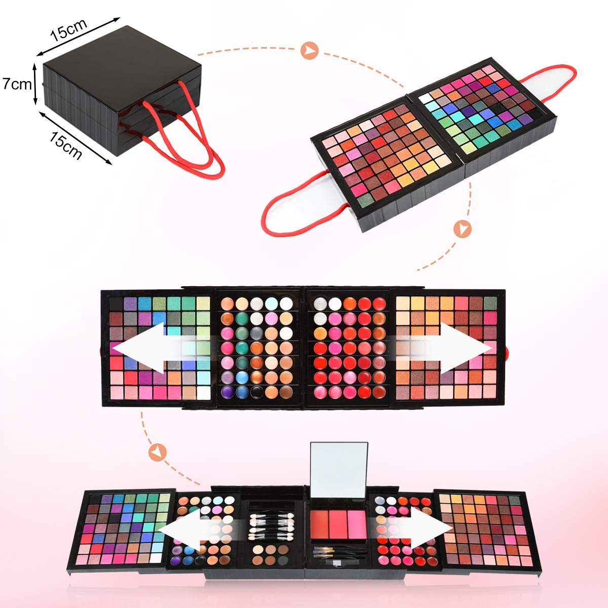 ABOUT THE PRODUCT: 1 > Portable And Convenient To Use: Size 5.9โ * 2.7โ, retractable compartments, 177 highly-pigmented matte and shimmery shades, a wide built-in mirror, and 14 applicators perfect for travel and on-the-go use 2 > All-in-One Makeup Kit : BIUBLE With 177 colors of eye shadows, lip glosses, concealers ,shading powder and blushes, this multi-purpose kit is perfect for achieving any full-face look.High quality ingredients with silky shine color, can last for all day long! Prefect for party makeup/casual makeup/wedding/kids makeup toys, etc 3 > Perfect cosmetic Kit :Velvety soft and smooth, easy to layer and blend. Enabling layering and mixing. Suitable for novice or experienced makeup artists to show their charm at various parties. Keep Kids Busy for Hours of Great FunHotrose Full 177 Color Pink Eyeshadow Palette Blush Lip Gloss Concealer Kit Beauty Makeup Set,All-in-One Makeup Kit with Mirror, Applicators