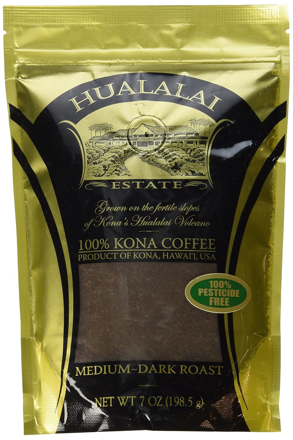 Hualalai Estate 100% Pure Kona Ground Coffee - Medium Dark Roasted Hawaiian Grown Beans - Pesticide-Free Gourmet Grade Premium Coffee
