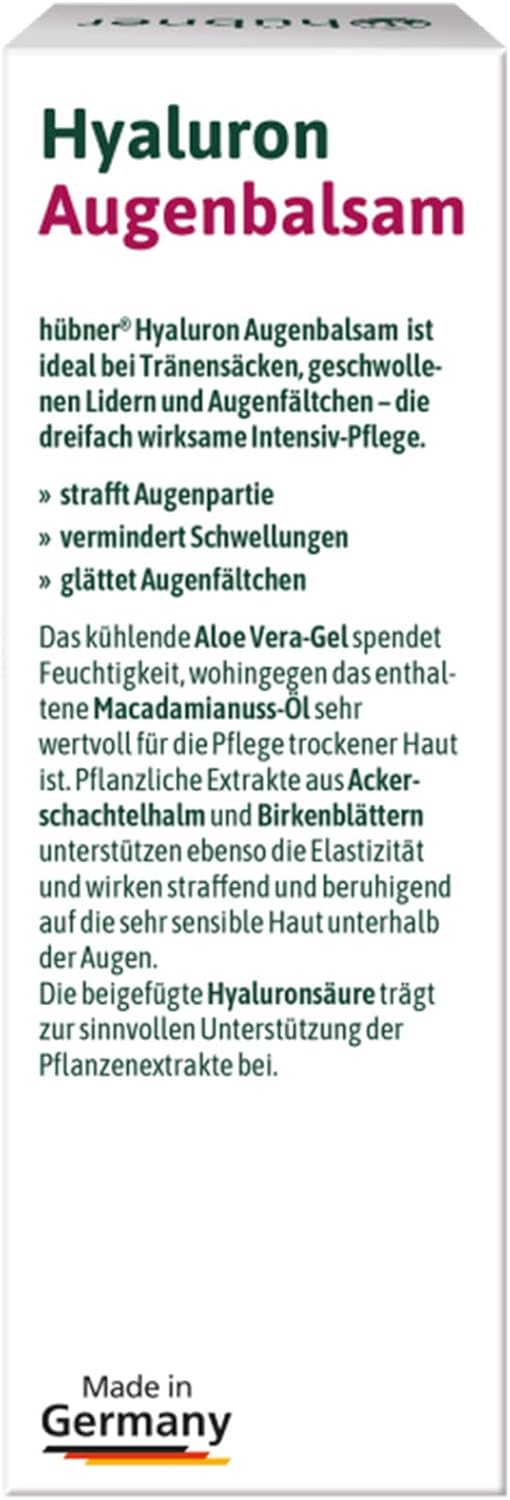 About this item Eye balm plus is an intensive care for the particularly sensitive skin particles around the eyes and especially recommended for bags of eyes, swollen eyelids and eye wrinkles. The skin is firm and smooth around the eyes thanks to plant ingredients such as field horsetail and birch leaves. These valuable plants support the elasticity of the skin, have a firming effect and have a soothing effect. Moisture and elasticity: This provides aloe vera and high molecular hyaluronic acid. This effect cushions and thus strengthens the wrinkle-minimising effect of plant extracts. Cooling aloe vera gel also provides an extra dose of refreshing moisture for the sensitive skin around the eye area. Proven wrinkle reduction has been confirmed by a clinically dermatological application study: With regular use, the skin gains significantly in elasticity and the depth of the eye wrinkles is proven to be reduced. The effect has been scientifically tested: With 75% of users, a positive effect could be registered. The depth of wrinkles has been reduced by 30%. The eye balm is ophthalmologically and dermatologically tested, well tolerated and suitable for contact lens wearers. It is also made in Germany and is vegan. › See more product details,Eye balm plus is an intensive care for the particularly sensitive skin particles around the eyes and especially recommended for bags of eyes, swollen eyelids and eye wrinkles,The skin is firm and smooth around the eyes thanks to plant ingredients such as field horsetail and birch leaves. These valuable plants support the elasticity of the skin, have a firming effect and have a soothing effect,Moisture and elasticity: This provides aloe vera and high molecular hyaluronic acid. This effect cushions and thus strengthens the wrinkle-minimising effect of plant extracts. Cooling aloe vera gel also provides an extra dose of refreshing moisture for the sensitive skin around the eye area,Proven wrinkle reduction has been confirmed by a clinically dermatological application study: With regular use, the skin gains significantly in elasticity and the depth of the eye wrinkles is proven to be reduced. The effect has been scientifically tested: With 75% of users, a positive effect could be registered. The depth of wrinkles has been reduced by 30%,The eye balm is ophthalmologically and dermatologically tested, well tolerated and suitable for contact lens wearers. It is also made in Germany and is vegan