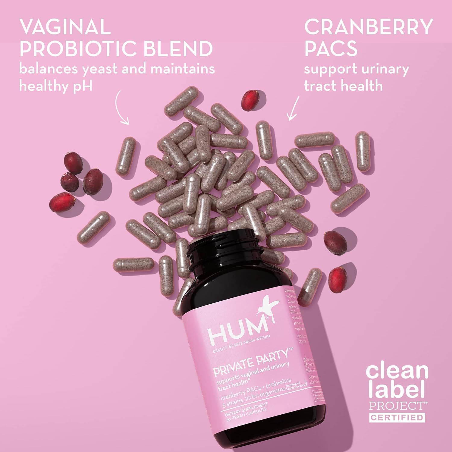 About this item VIP Vaginal Health Support – Formulated to support a balanced vaginal microbiome and healthy pH levels, promoting optimal urinary tract function and overall vaginal health. Powerful Probiotic Blend for Women – Includes 3 Lactobacillus strains, plus cranberry PACs, to help maintain vaginal flora and support feminine health. Clinically Tested for Vaginal Health – 100% of participants felt more confident after taking Private Party.* This blend is crafted to maintain pH balance and healthy yeast levels. Clean and Clinically Studied. HUM products are Clean Label Project Certified, non-GMO, and rigorously tested to meet the highest standards of safety and quality, free from artificial flavors, sweeteners and colors. How to Take– Take 1 capsule daily, with or without food. See more product details,VIP Vaginal Health Support – Formulated to support a balanced vaginal microbiome and healthy pH levels, promoting optimal urinary tract function and overall vaginal health,Powerful Probiotic Blend for Women – Includes 3 Lactobacillus strains, plus cranberry PACs, to help maintain vaginal flora and support feminine health,Clinically Tested for Vaginal Health – 100% of participants felt more confident after taking Private Party.* This blend is crafted to maintain pH balance and healthy yeast levels,Clean and Clinically Studied. HUM products are Clean Label Project Certified, non-GMO, and rigorously tested to meet the highest standards of safety and quality, free from artificial flavors, sweeteners and colors,How to Take– Take 1 capsule daily, with or without food