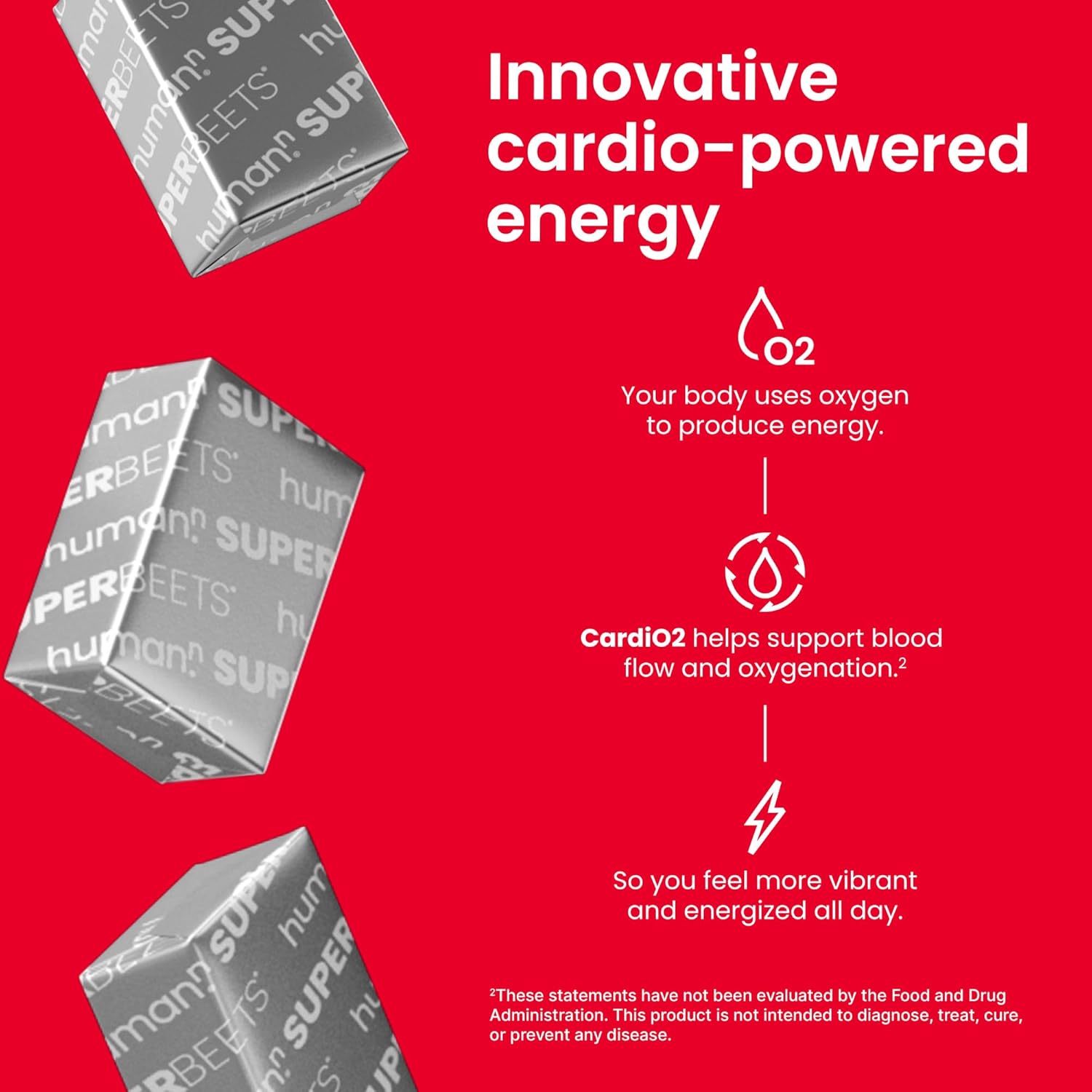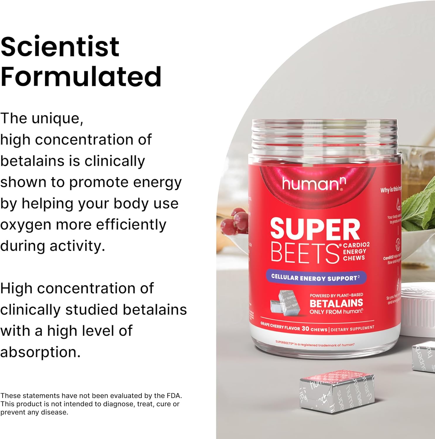 About this item Doctor recommended: SuperBeets is the #1 Cardiologist, Doctor, and Pharmacist recommended beet brand for heart health support.* Healthy energy like never before: SuperBeets CardioO2 is the only beet energy chew that can deliver these highly concentrated betalains at this level of high absorption to truly unlock its cardiovascular and oxygenating potential. Clinically studied compound: The unique, highly concentrated betalains compound in SuperBeets CardiO2 was clinically shown to promote energy by helping your body use oxygen more efficiently during activity. Untapped energy resource: Experts have long recognized the cardio-powering energy benefits of betalains. The fact is thereās just never been an energy chew that could isolate them this effectively at this concentrated dosage to capture these benefits. Convenient & delicious: Individually wrapped to grab and go, SuperBeets CardiO2 Beet Energy Chews in grape cherry flavor is such a convenient and delicious way to help you feel more energized. See more product details,Doctor recommended: SuperBeets is the #1 Cardiologist, Doctor, and Pharmacist recommended beet brand for heart health support,Healthy energy like never before: SuperBeets CardioO2 is the only beet energy chew that can deliver these highly concentrated betalains at this level of high absorption to truly unlock its cardiovascular and oxygenating potential,Clinically studied compound: The unique, highly concentrated betalains compound in SuperBeets CardiO2 was clinically shown to promote energy by helping your body use oxygen more efficiently during activity,Untapped energy resource: Experts have long recognized the cardio-powering energy benefits of betalains. The fact is thereās just never been an energy chew that could isolate them this effectively at this concentrated dosage to capture these benefits,Convenient & delicious: Individually wrapped to grab and go, SuperBeets CardiO2 Beet Energy Chews in grape cherry flavor is such a convenient and delicious way to help you feel more energized