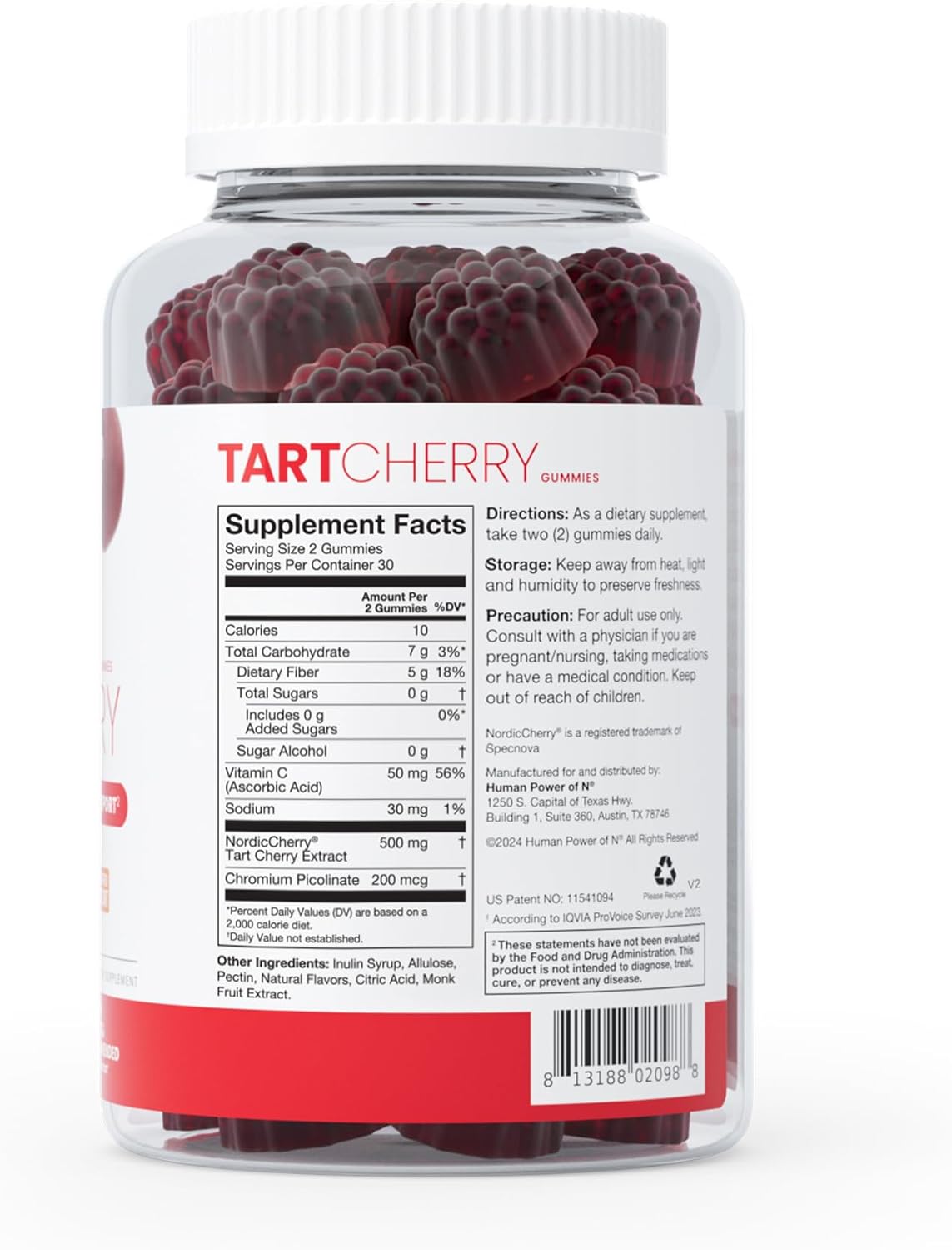Each serving (two gummies) contains 500mg of clinically researched Danish Tart Cherry Extract, the antioxidant equivalent of 100 tart cherries, or 16 ounces of tart cherry juice