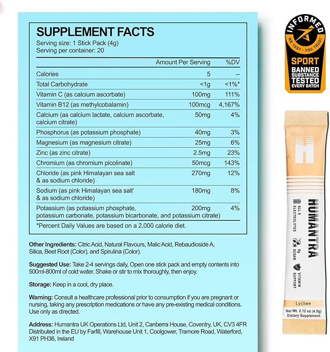 Humantra Hydration Packets | Zero Sugar Electrolyte Hydration Multiplier W/Essential Minerals & 6 Electrolytes | Electrolytes Powder (20 Count, Lychee)