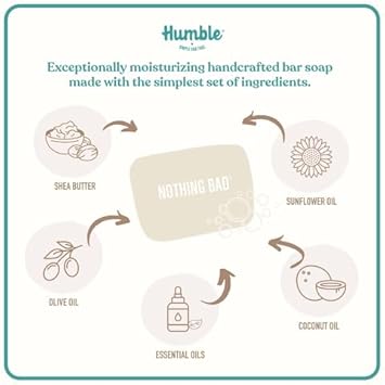 About this item COLD PROCESS SOAP: Our moisturizing handmade, cold processed artisan soap bars are made traditionally with plant-based whole oils. Perfect for hands, face, body and shaving. NOTHING BAD: Biodegradable and free from triclosan, sulfates, parabens, synthetic fragrances. CERTIFIED CRUELTY-FREE: Certified cruelty-free by the Leaping Bunny Certification Program; the international gold standard for non-animal tested consumer products. Organic, vegan, and non-GMO, Humble Brands bar soap body wash is gentle enough for the entire family. CRAFTED WITH CARE using traditional soap making methods to retain benefits and potency of organic scents and ingredients. Our cold-process bars are friendly for even the most sensitive skin. Plus, the rich lather and tiny bubbles are fun for all ages. LAVENDER SCENTED SOAP: High elevation lavender delivers just-picked freshness and sweet herbaceous aromatics. Beloved for its calming effects, our rendition of lavender is clean, bright, and full-bodied. See more product details,COLD PROCESS SOAP: Our moisturizing handmade, cold processed artisan soap bars are made traditionally with plant-based whole oils. Perfect for hands, face, body and shaving,NOTHING BAD: Biodegradable and free from triclosan, sulfates, parabens, synthetic fragrances,CERTIFIED CRUELTY-FREE: Certified cruelty-free by the Leaping Bunny Certification Program; the international gold standard for non-animal tested consumer products. Organic, vegan, and non-GMO, Humble Brands bar soap body wash is gentle enough for the entire family,CRAFTED WITH CARE using traditional soap making methods to retain benefits and potency of organic scents and ingredients. Our cold-process bars are friendly for even the most sensitive skin. Plus, the rich lather and tiny bubbles are fun for all ages,LAVENDER SCENTED SOAP: High elevation lavender delivers just-picked freshness and sweet herbaceous aromatics. Beloved for its calming effects, our rendition of lavender is clean, bright, and full-bodied