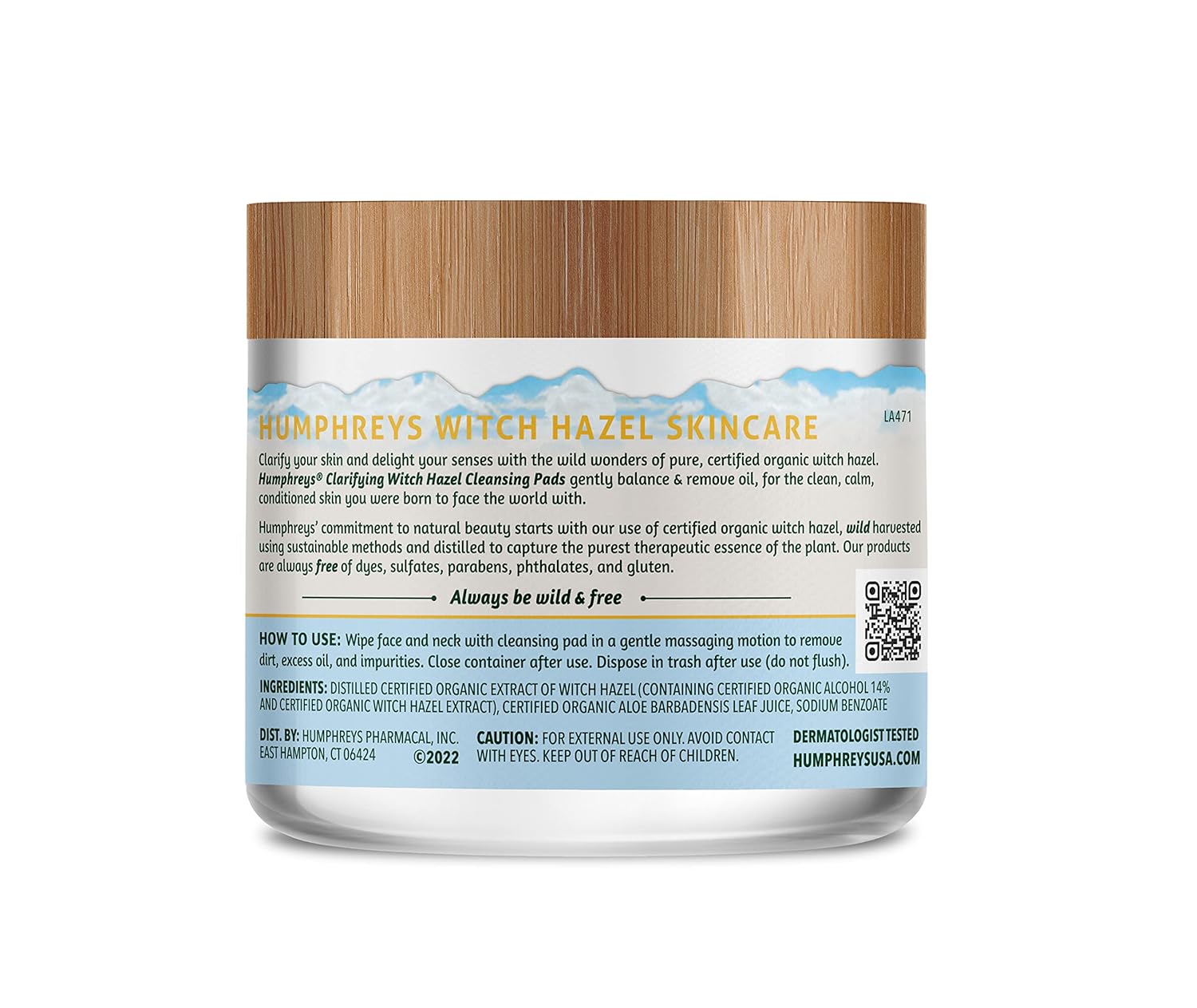 Nourish your skin and senses with certified organic witch hazel. Humphreys Nourishing Witch Hazel + Aloe Alcohol Free Cleansing Pads are unscented and help balance your complexion for the clean, calm, conditioned skin you were born to face the world with. Humphreys' commitment to natural beauty starts with our use of certified organic witch hazel, wild harvested using sustainable methods and distilled to capture the purest therapeutic essence of the plant. Our products are always free of dyes, sulfates, parabens, phthalates, and gluten,NOURISH & CLEANSE ON-THE-GO: Gently remove impurities while balancing your complexion with these alcohol-free, ready-to-use cleansing pads,SOOTHING & HYDRATING BOTANICAL FORMULA: Infused with organic witch hazel, aloe, and vitamin E to cleanse without over-drying, leaving skin soft and refreshed,WILD HARVESTED WITCH HAZEL: Made with organic, wild witch hazel, selectively and sustainably harvested in New England to promote forest health and capture the most potent benefits of witch hazel's botanical remedies,ETHICAL & ECO-FRIENDLY PROCESS: Cruelty-free, dermatologist-tested, and sustainably sourced, with biodegradable pads for a planet-friendly skincare routine,PURE & NATURAL INGREDIENTS: Free from dyes, sulfates, parabens, phthalates, and gluten, featuring nourishing aloe for gentle yet effective cleansing. For best results, wipe face and neck with a cleansing pad using a gentle messaging motion