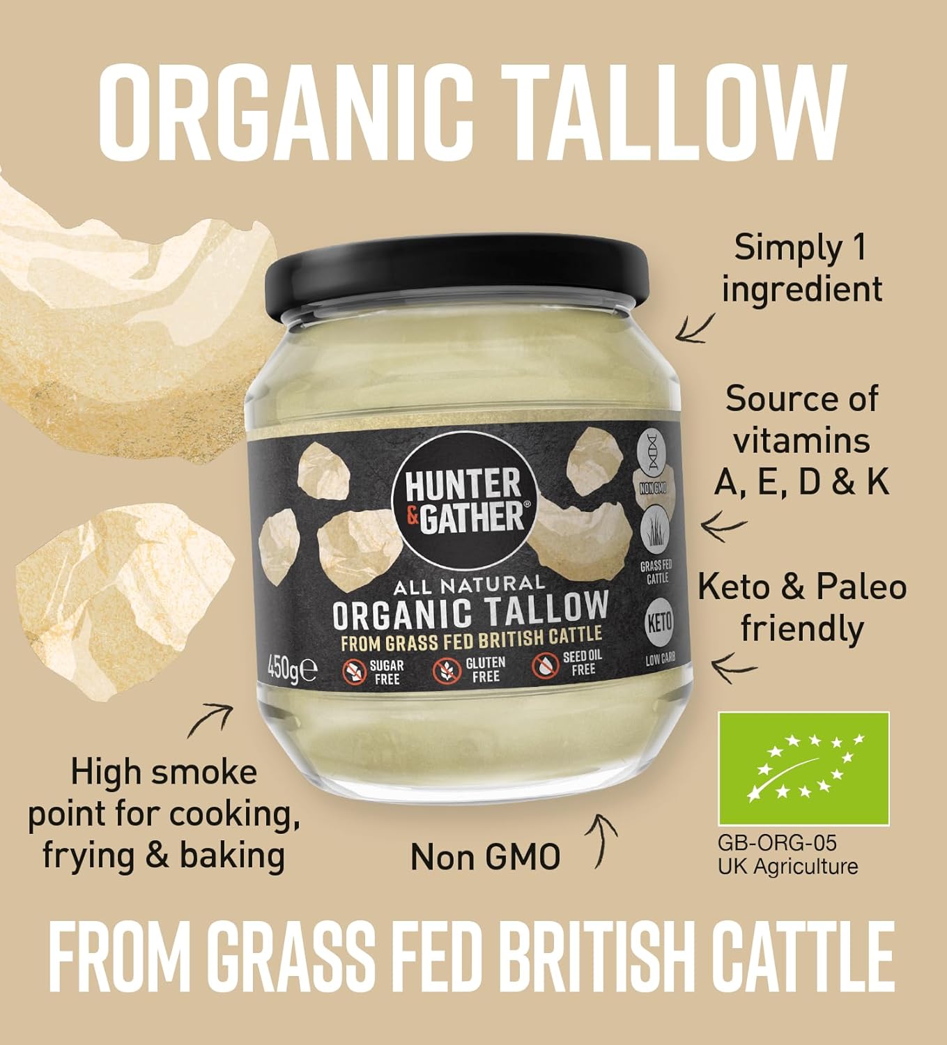 Hunter & Gather Organic Beef Tallow From Grass Fed British Cows 450G | Gluten Free, Seed Oil Free | Keto, Low Carb, Paleo I Ancestrally Inspired Nutrition I Simply 1 Ingredient I Glass Jar