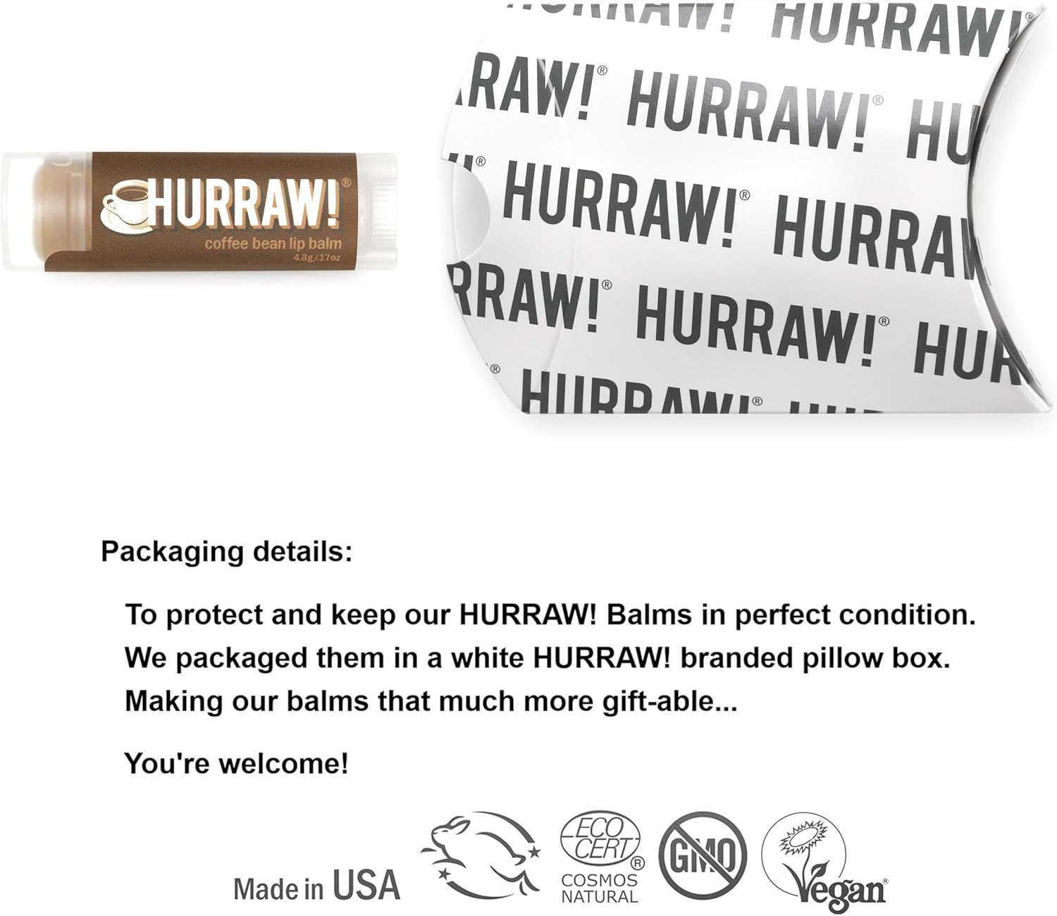 About this item ONE 4.8g/.17oz Oval Tube of Coffee Bean Lip Balm packaged in a white HURRAW! branded pillow box. Coffee bean extract and a touch of raw chocolate gives our balm a mild coffee-choco flavor and buzz. Not your normal cup-o-joe! Made with certified organic, vegan, and raw ingredients. Hurraw! Lip Balms are certified 100% all natural origin, cruelty and gluten free. Non-GMO. Bee, Shea, Soy and Palm Free. CRITERIA: Hurraw! Lip Balms are all natural, vegan, raw, made with premium fair trade ingredients, super smooth, not draggy, not sticky, not sweet, not too glossy, not too smelly. Never grainy. Long lasting and no melting in a back jean pocket! Made in Montana, USA. DETAILS: To ensure the integrity of our lip balms, we develop and manufacture fresh by individually pouring each balm in our USDA NOP (National Organic Program) and Ecocert certified facility. Our ingredients are also clearly and correctly listed on our balms. Plant based, cosmetic and USDA food grade. Derived from 100% natural sources and certified Ecocert COSMOS and NOP organic compliant. FLAVORS: Almond, Apple, Banana, Black Cherry Tinted, Chai Spice, Chocolate, Coconut, Coffee Bean, Earl Grey, Grapefruit, Green Tea, Hazelnut Tinted, Huckleberry, Kapha (grapefruit ginger eucalyptus), Lemon, Licorice, Lime, Mint, Moon, Orange, Pineapple, Pitta (coconut mint lemongrass), Raspberry Tinted, Root Beer, Sun, Unscented, Vanilla Bean, Vata (almond cardamom rose), Watermelon, Wintermint. It's not about us. Since 2010, we’ve made our balms with one thing in mind: YOU. Hurraw! strives to create a trusted product to be used by everyone regardless of lifestyle. Let's put the concept ahead of the profit, the user ahead of the maker, the collective ahead of the individual. See more product details,ONE 4.8g/.17oz Oval Tube of Coffee Bean Lip Balm packaged in a white HURRAW! branded pillow box. Coffee bean extract and a touch of raw chocolate gives our balm a mild coffee-choco flavor and buzz. Not your normal cup-o-joe! Made with certified organic, vegan, and raw ingredients. Hurraw! Lip Balms are certified 100% all natural origin, cruelty and gluten free. Non-GMO. Bee, Shea, Soy and Palm Free,CRITERIA: Hurraw! Lip Balms are all natural, vegan, raw, made with premium fair trade ingredients, super smooth, not draggy, not sticky, not sweet, not too glossy, not too smelly. Never grainy. Long lasting and no melting in a back jean pocket! Made in Montana, USA,DETAILS: To ensure the integrity of our lip balms, we develop and manufacture fresh by individually pouring each balm in our USDA NOP (National Organic Program) and Ecocert certified facility. Our ingredients are also clearly and correctly listed on our balms. Plant based, cosmetic and USDA food grade. Derived from 100% natural sources and certified Ecocert COSMOS and NOP organic compliant,FLAVORS: Almond, Apple, Banana, Black Cherry Tinted, Chai Spice, Chocolate, Coconut, Coffee Bean, Earl Grey, Grapefruit, Green Tea, Hazelnut Tinted, Huckleberry, Kapha (grapefruit ginger eucalyptus), Lemon, Licorice, Lime, Mint, Moon, Orange, Pineapple, Pitta (coconut mint lemongrass), Raspberry Tinted, Root Beer, Sun, Unscented, Vanilla Bean, Vata (almond cardamom rose), Watermelon, Wintermint,It's not about us. Since 2010, we’ve made our balms with one thing in mind: YOU. Hurraw! strives to create a trusted product to be used by everyone regardless of lifestyle. Let's put the concept ahead of the profit, the user ahead of the maker, the collective ahead of the individual