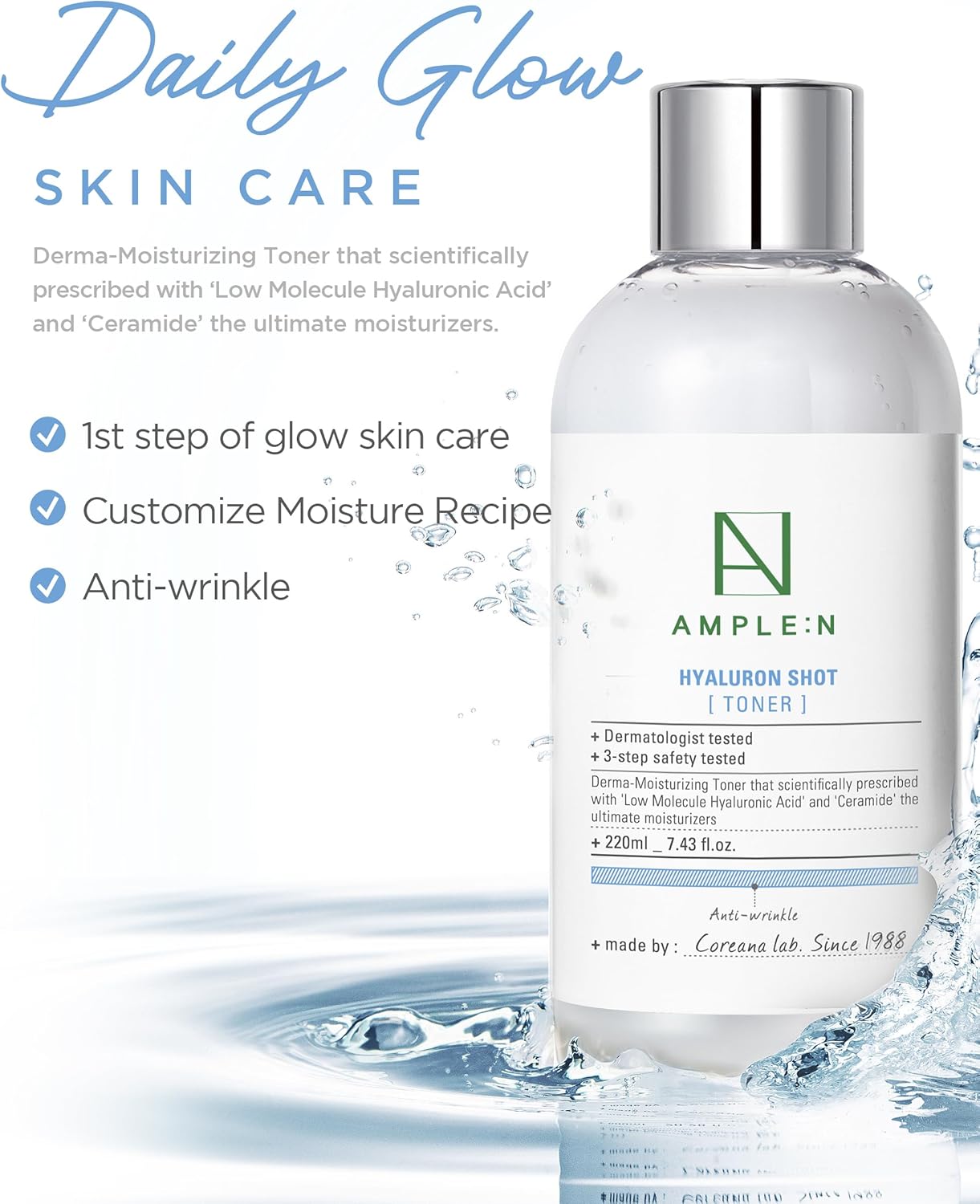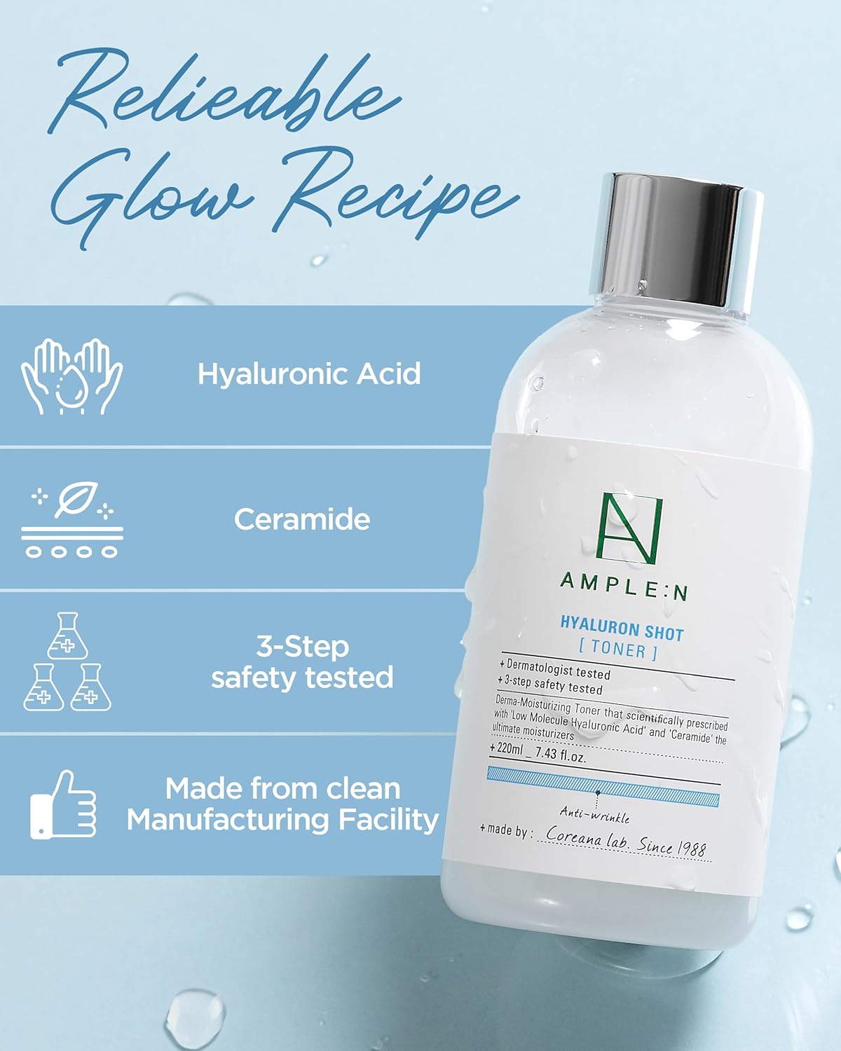 About this item SOOTHING & EXFOLIATING TONER: Feel the freshness of cooling ingredients with our face toner enriched with hyaluronic acid and xylitol complex. The refreshing ingredients in our facial toner will deep clean the skin pores, exfoliates, and moisturize skin to improve clarity and smoothness. OFFERS INTENSE MOISTURIZATION: AMPLE:N Hyaluron Shot Toner exfoliating toner will help renew the skin cells and strengthen the moisture barrier. This hydrating toner for dry and oily skin keeps the dry and dull skin soft, hydrated and dewy, and nourished even in dry weather. REGULATES OIL EXCRETION: Our oily skincare helps to cleanse fine dust and other impurities from the pores and allows the skin to breathe. This pore refining face toner regulates oil secretion and controls sebum production while tightening the pores to offer a youthful, shine-free glow. FOR SKIN THAT LOOKS YOUNG: This anti-aging face essence toner with nourishing ingredients helps to improve skin elasticity by diminishing the appearance of wrinkles and minimizing the pores. It helps you achieve visibly lifted skin that looks younger, smoother, and firmer. HOW TO USE: After cleansing in the morning and evening, moisten an appropriate amount on a cotton pad and gently wipe it out from the inside of the face to the outward direction. Our pore cleanser suits every skin type. See more product details,SOOTHING & EXFOLIATING TONER: Feel the freshness of cooling ingredients with our face toner enriched with hyaluronic acid and xylitol complex. The refreshing ingredients in our facial toner will deep clean the skin pores, exfoliates, and moisturize skin to improve clarity and smoothness,OFFERS INTENSE MOISTURIZATION: AMPLE:N Hyaluron Shot Toner exfoliating toner will help renew the skin cells and strengthen the moisture barrier. This hydrating toner for dry and oily skin keeps the dry and dull skin soft, hydrated and dewy, and nourished even in dry weather,REGULATES OIL EXCRETION: Our oily skincare helps to cleanse fine dust and other impurities from the pores and allows the skin to breathe. This pore refining face toner regulates oil secretion and controls sebum production while tightening the pores to offer a youthful, shine-free glow,FOR SKIN THAT LOOKS YOUNG: This anti-aging face essence toner with nourishing ingredients helps to improve skin elasticity by diminishing the appearance of wrinkles and minimizing the pores. It helps you achieve visibly lifted skin that looks younger, smoother, and firmer,HOW TO USE: After cleansing in the morning and evening, moisten an appropriate amount on a cotton pad and gently wipe it out from the inside of the face to the outward direction. Our pore cleanser suits every skin type