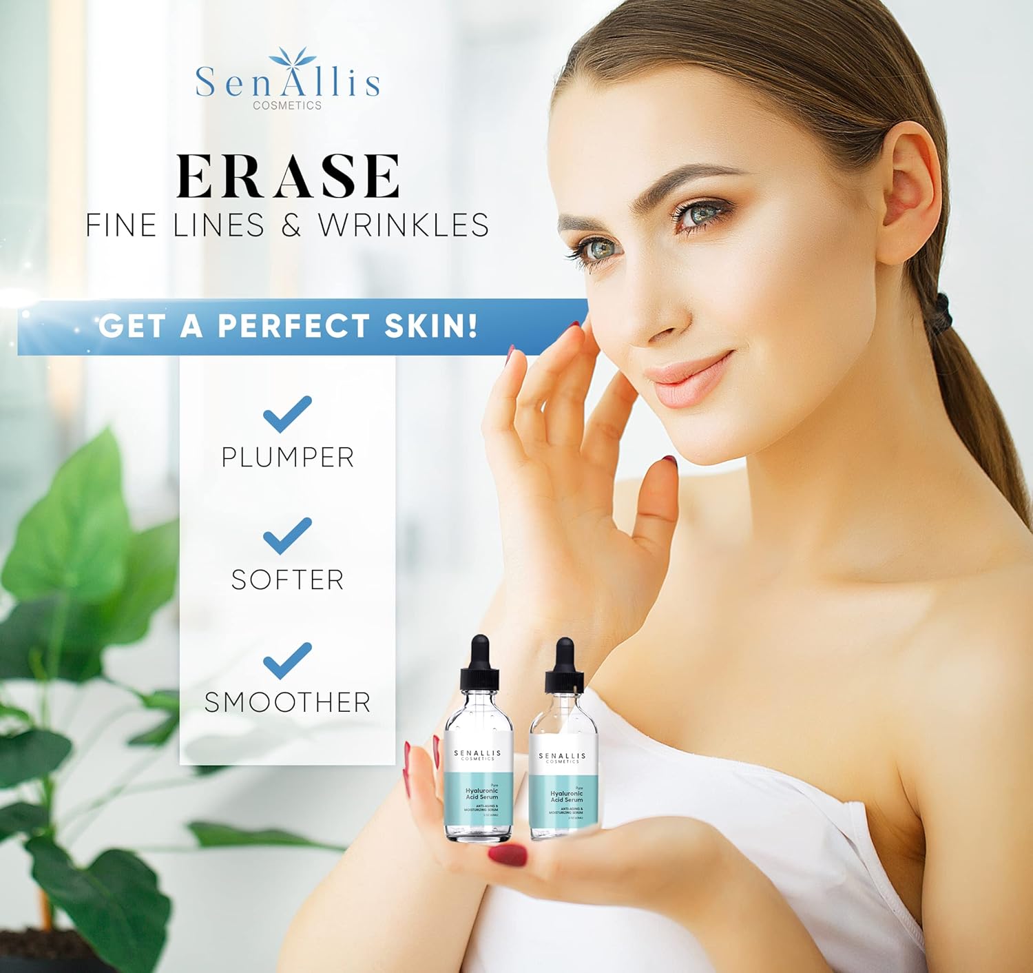 ABOUT THE PRODUCT: 1 > For ultra hydrated and soft skin, Hyaluronic Acid serum is like magic! Our hyaluronic acid serum pulls water from a moisturizer or damp skin and absorbs it, hyaluronic acid has the ability to absorb up to 500x its weight of water 2 > You receieve a large 2 oz bottle, and also you will receive an additional smaller 2 oz bottle, thats two for the price of one 3 > Syrup like consistency, which is thicker than a majority of our competitors while still being easy to spreadHyaluronic Acid (HA) helps to reduce wrinkles and other signs of aging, and did you know that it can hold up to 500x its weight in water It's acts as a great humectant when a moisturizer is applied over it. We are the direct manufacturer of our product and quality means everything to us, that's why they're made right here in the United States. Keep your skin looking youthful with our Hylauronic Acid serum pack, it comes with a 2 oz dropper bottle and another 2 oz dropper bottle. Keeping your skin moisturized is an important part and crucial element when using a Hyaluronic Acid serum, the HA pulls moisture from the air, and during the colder months the air will want to pull moisture from wetter objects, such as your skin, much like opening the window during a cool day will lower your homes temperature, make sure to add a moisturizer on top of this product once you apply it and it begins to dry. Helps to hide signs of aging such as, wrinkles, large pores, dark spots and slight imperfections on your skin. -30 days refund -No FRAGRANCES, PTHALATES, PARABENS