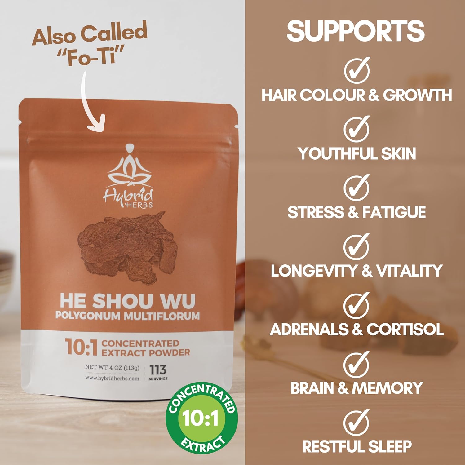 Hybrid Herbs - He Shou Wu Powder 10X Strength - Natural Supplement For Hair Growth & Colour, Skin, Fertility Support, Rich In Antioxidants | Fo-Ti High Potency 10:1 Extract - 113 Servings (113G)