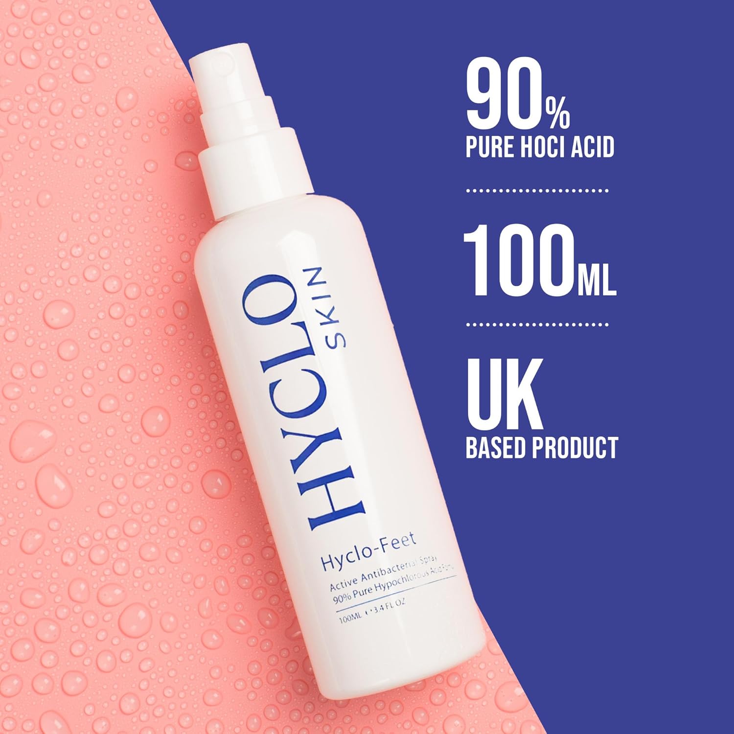 About this item ULTIMATE ANTIBACTERIAL DEFENCE - Formulated with 90% Pure Hypochlorous Acid, Hyclo Antibacterial Feet Spray effectively eliminates bacteria, fungi and viruses on the skin's surface, providing protection against foot infections like athletes foot. SOOTHES & PROMOTES HEALING - This gentle anti bacterial spray for feet calms irritation, reduces redness and speeds up the recovery of wounds and minor burns, minimising the risk of infection and scarring while leaving your feet feeling soft and hydrated. 100% Natural & SAFE - Powered by a naturally occurring component of our immune response, our hypochlorous acid antibac foot spray is non-toxic, vegan and suitable even for sensitive skin, ensuring a safe and effective way to keep feet antibacterial fresh. CONVENIENT FOOT SPRAY - Use Hyclo antifungal feet spray after showering, workouts or anytime your feet need a refresh. Perfect for daily use to maintain clean and healthy feet, making it an essential addition to your foot care routine & feet odor control. INNOVATIVE BEAUTY BRAND - Hyclo Skin is a pioneering UK skincare brand designed to tackle skin irritations, hygiene, acne, eczema, rosacea and sunburn with breakthrough products. Embrace confidence in your skincare journey with our MONEY BACK GUARANTEE. โบ See more product details,ULTIMATE ANTIBACTERIAL DEFENCE - Formulated with 90% Pure Hypochlorous Acid, Hyclo Antibacterial Feet Spray effectively eliminates bacteria, fungi and viruses on the skin's surface, providing protection against foot infections like athletes foot,SOOTHES & PROMOTES HEALING - This gentle anti bacterial spray for feet calms irritation, reduces redness and speeds up the recovery of wounds and minor burns, minimising the risk of infection and scarring while leaving your feet feeling soft and hydrated,100% Natural & SAFE - Powered by a naturally occurring component of our immune response, our hypochlorous acid antibac foot spray is non-toxic, vegan and suitable even for sensitive skin, ensuring a safe and effective way to keep feet antibacterial fresh,CONVENIENT FOOT SPRAY - Use Hyclo antifungal feet spray after showering, workouts or anytime your feet need a refresh. Perfect for daily use to maintain clean and healthy feet, making it an essential addition to your foot care routine & feet odor control,INNOVATIVE BEAUTY BRAND - Hyclo Skin is a pioneering UK skincare brand designed to tackle skin irritations, hygiene, acne, eczema, rosacea and sunburn with breakthrough products. Embrace confidence in your skincare journey with our MONEY BACK GUARANTEE