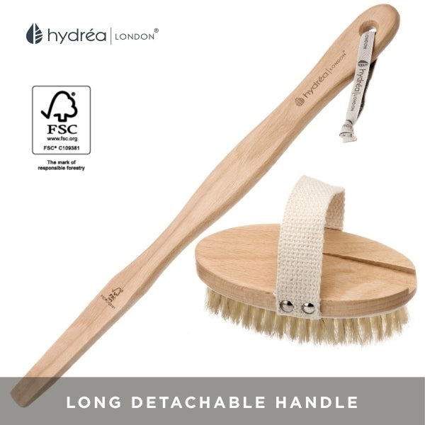 Whether used dry before showering for energizing exfoliation or wet with your favourite body wash for a luxurious cleansing experience, this brush adapts to your needs and is suitable for all skin types. The firm yet gentle bristles effectively exfoliate, removing dead skin cells and impurities, improving skin tone, and stimulating circulation. Regular brushing encourages blood flow to flush the skin with essential nutrients and promotes lymphatic drainage, which helps detoxify the skin and reduce the appearance and feel of cellulite. Beautifully designed with a long FSC certified wooden handle which makes reaching the back, legs and other hard to reach areas effortless. The handle can be detached when a firmer, more controlled brushing experience is required. Enjoy softer, smoother skin and a spa-like experience at home with this eco-conscious body brush