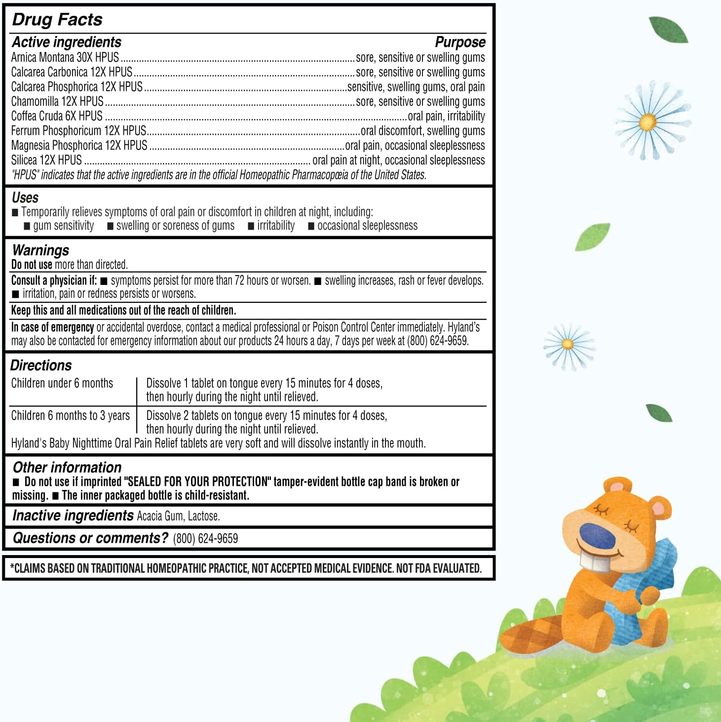 About this item NIGHTTIME RELIEF OF ORAL SWELLING, DISCOMFORT AND IRRITABILITY: Naturally relieves the symptoms of oral discomfort including sore, sensitive or swelling gums, irritability and occasional sleeplessness at night EASY TO USE: Easy to administer, quick-dissolving tablets melt in your baby's mouth instantly KEEPING FAMILIES HEALTHY: Hyland’s is a leading consumer health brand with more than a century of history making high quality products to help people live healthier and happier lives Made with natural active ingredients, our products contain no artificial flavors or sugars, dyes or parabens With a state-of-the-art, FDA regulated and cGMP compliant facility, our top-selling products are sold in more than 15 countries and can be found in every major retailer in the United States See more product details,NIGHTTIME RELIEF OF ORAL SWELLING, DISCOMFORT AND IRRITABILITY: Naturally relieves the symptoms of oral discomfort including sore, sensitive or swelling gums, irritability and occasional sleeplessness at night,EASY TO USE: Easy to administer, quick-dissolving tablets melt in your baby's mouth instantly,KEEPING FAMILIES HEALTHY: Hyland’s is a leading consumer health brand with more than a century of history making high quality products to help people live healthier and happier lives,Made with natural active ingredients, our products contain no artificial flavors or sugars, dyes or parabens,With a state-of-the-art, FDA regulated and cGMP compliant facility, our top-selling products are sold in more than 15 countries and can be found in every major retailer in the United States