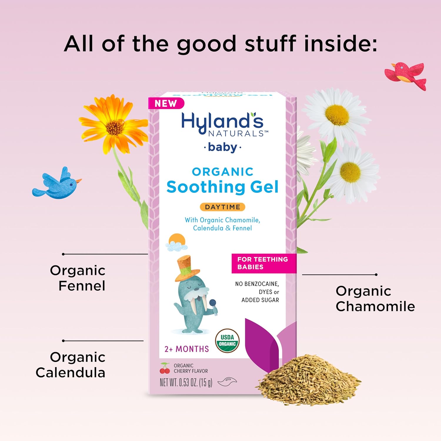 Hyland'S Baby Organic Day Oral Soothing Gel, With Chamomile, Calendula, And Fennel, Cooling Gel For Oral Discomfort, Easy-To-Apply, Ages 2 Months And Up, 0.53 Ounce