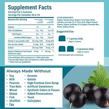 About this item KIDS ORGANIC ELDERBERRY PLUS GUMMIES: Defend the health of your little ones with these powerful immune supportive gummies; Specially formulated for kids, these yummy berry-flavored USDA-certified organic gummies are gluten-free, vegan, and made with fruit pectin and natural sweeteners IMMUNE SUPERHEROES: Formulated with organic Black Elderberry, Zinc and Vitamin C, these gummies support healthy immune function in children; Low sugar with a delicious berry flavor SUGGESTED USE: Kids ages 2-3 take 1 gummy daily; Ages 4+ take 2 gummies daily; Easy to chew for children; 48 vegan gummies FREE OF UNNATURAL INGREDIENTS: Made without all 9 major allergens; No synthetic colors; No artificial flavors and artificial sweeteners; No gelatin, no high-fructose corn syrup, no added preservatives TRUSTWORTHY: Each batch is third-party tested for purity and potency; Certified USDA organic by QAI; Manufactured in the USA in an NSF certified facility See more product details,KIDS ORGANIC ELDERBERRY PLUS GUMMIES: Defend the health of your little ones with these powerful immune supportive gummies; Specially formulated for kids, these yummy berry-flavored USDA-certified organic gummies are gluten-free, vegan, and made with fruit pectin and natural sweeteners,IMMUNE SUPERHEROES: Formulated with organic Black Elderberry, Zinc and Vitamin C, these gummies support healthy immune function in children; Low sugar with a delicious berry flavor,SUGGESTED USE: Kids ages 2-3 take 1 gummy daily; Ages 4+ take 2 gummies daily; Easy to chew for children; 48 vegan gummies,FREE OF UNNATURAL INGREDIENTS: Made without all 9 major allergens; No synthetic colors; No artificial flavors and artificial sweeteners; No gelatin, no high-fructose corn syrup, no added preservatives,TRUSTWORTHY: Each batch is third-party tested for purity and potency; Certified USDA organic by QAI; Manufactured in the USA in an NSF certified facility