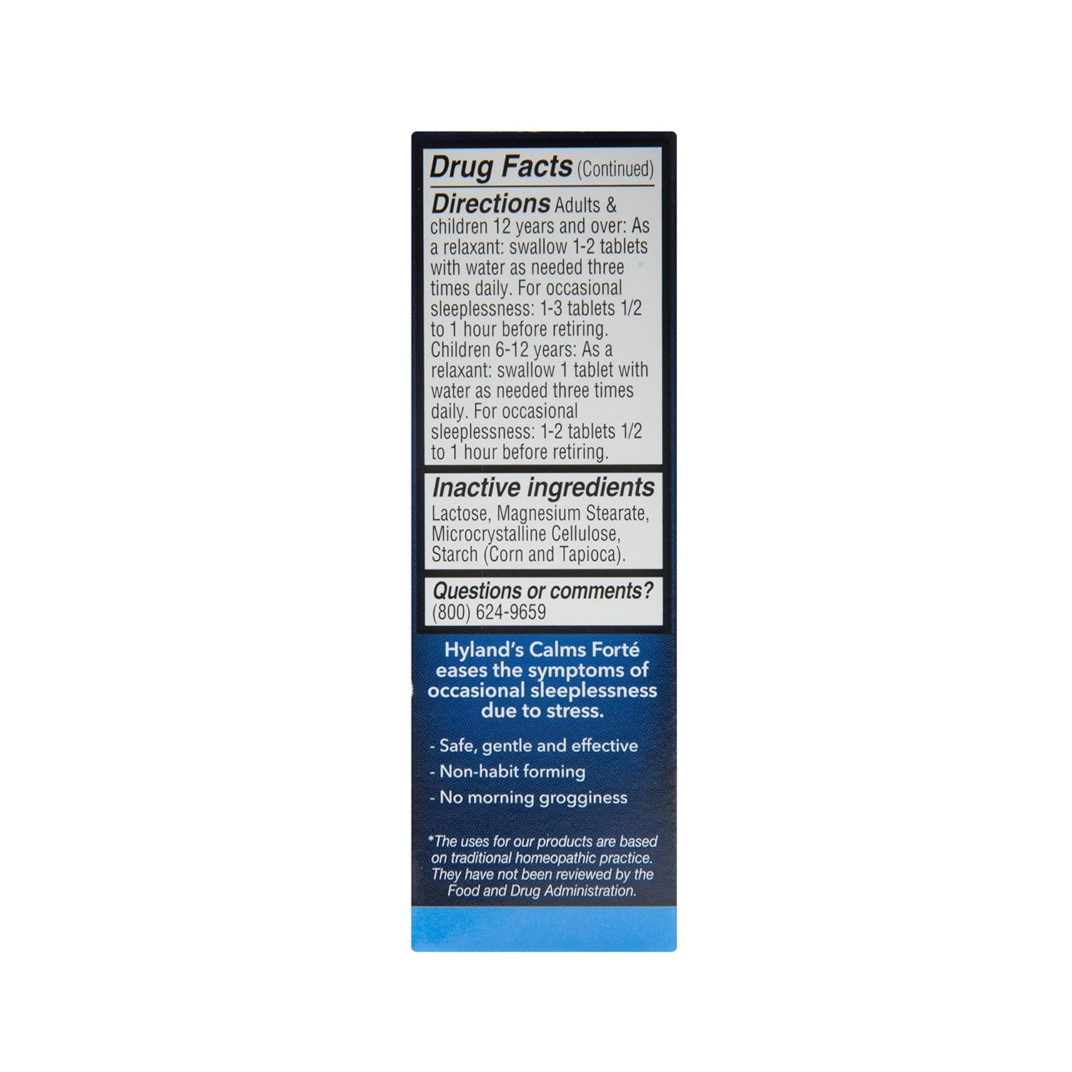RELIEF OF OCCASIONAL SLEEPLESSNESS DUE TO STRESS: Natural relief of occasional sleeplessness and restlessness with accompanying stress, anxiousness, nervousness and irritability10EASY TO TAKE: Easy to swallow tablets to ease tension and promote sleep naturally10100 TABLETS = UP TO 100 DOSES of Hyland's Calms Forté tablets10SAFE AND GENTLE: Hyland's formulas are made with natural active ingredients and have no known drug interactions10KEEPING FAMILIES HEALTHY: Hyland’s Naturals is a leading consumer health brand with more than a century of history making high quality products to help people live healthier and happier lives1010