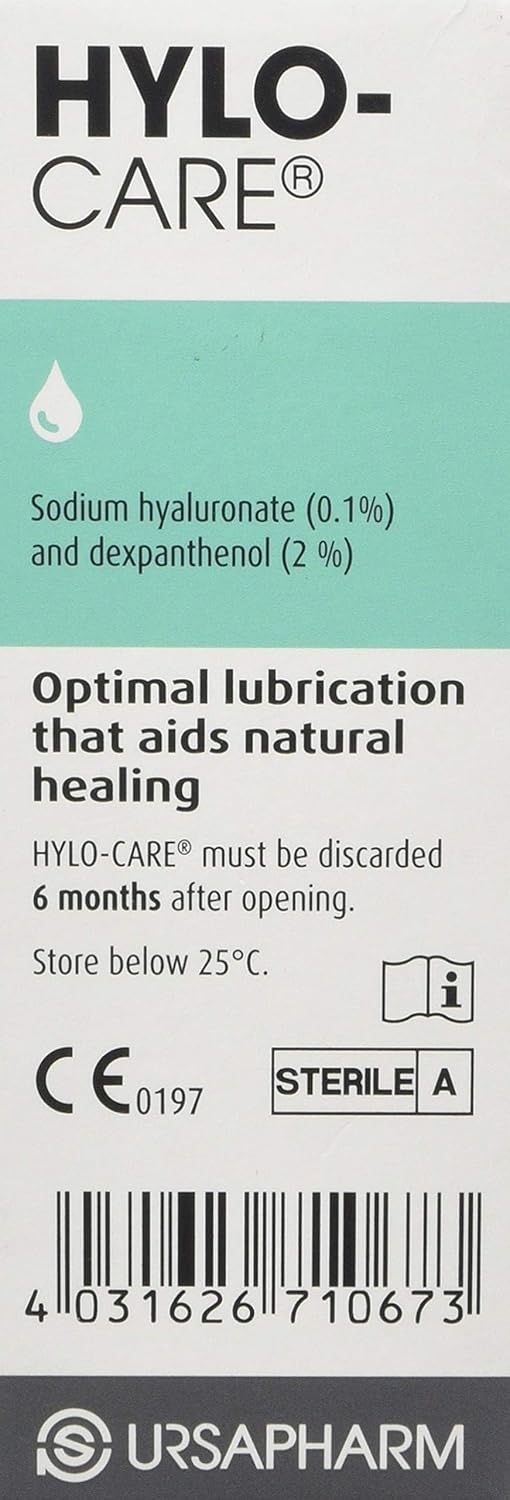 Product Description The HYLO® product family is the No. 1 in Germany when it comes to dry eyes. The eyes are our most important sensory organ and give us unique moments every day. That is why the health of your eyes is especially important to us! Ingredients Sodium Hyaluronate, Dexpanthenol, Purified Water, Disodium Phosphate, Sodium Dihydrogen Phosphate Dihydrate, Sodium Chloride, Benzalkonium Chloride (as a preservative) P.when('A').execute(function(A) { A.on('a:expander:toggle_description:toggle:collapse', function(data) { window.scroll(0, data.expander.$expander[0].offsetTop-100); }); }); Directions For ophthalmic use only. Tilt the head back, pull down the lower eyelid, and instill one drop into the conjunctival sac of the affected eye(s). Blink a few times to ensure the solution spreads evenly. Use as often as needed or as directed by your healthcare professional. Safety Warning Keep out of reach of children. Do not touch the tip of the container to any surface to avoid contamination. Do not use if the solution changes color or becomes cloudy. Discontinue use if irritation persists and consult a healthcare professional. Store at room temperature. See more,HYLO Care contains 0.1% sodium hyaluronate and also 2% Dexpanthenol which provides the surface of the eye with support for healing post operation or eye injury,Suitable for either damage to the surface of the eye, eye injury and dry eye,HYLO Care eye drops for dry eyes are contained within a unique bottle design. 1 pump of the bottle gives 1 drop. 300 drops per bottle,Do you wear contact lenses Not a problem as HYLO Care dry eye drops can be used by contact lens wearers,A long-lasting and robust formula. Can be used for 6 months after first opening and can be stored at room temperature