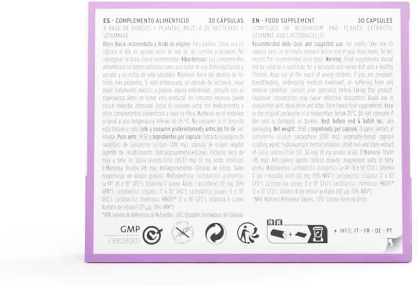 About this item SUPPORT INTIMATE HEALTH. With Hifas da Terra, maintain an optimal balance of the vaginal microbiome with this capsule supplement, which combines Lactobacillus and Reishi extract, promoting a healthy environment and protecting against common imbalances IMMUNE SYSTEM REINFORCEMENT. Formulated with natural ingredients that boost the body's defenses, such as reishi extract, known for its immunostimulating properties, contributing to a better immune system response MAINTENANCE OF MUCOSA. Helps preserve the integrity of the mucous membranes thanks to its formulation with probiotics, which facilitate the regeneration and maintenance of healthy tissues, vital for female intimate well-being INNOVATIVE FORMULA. Hifas da Terra combines effectiveness and nature in a single capsule daily, providing an integral solution for intimate and general care, with a synergy of benefits and properties developed under dermatological and gynecological control ALLERGEN FREE PLANT CAPSULES Presentation in easy-to-eat capsules, suitable for celiacs, lactose intolerants, vegetarians and vegans › See more product details,SUPPORT INTIMATE HEALTH. With Hifas da Terra, maintain an optimal balance of the vaginal microbiome with this capsule supplement, which combines Lactobacillus and Reishi extract, promoting a healthy environment and protecting against common imbalances,IMMUNE SYSTEM REINFORCEMENT. Formulated with natural ingredients that boost the body's defenses, such as reishi extract, known for its immunostimulating properties, contributing to a better immune system response,MAINTENANCE OF MUCOSA. Helps preserve the integrity of the mucous membranes thanks to its formulation with probiotics, which facilitate the regeneration and maintenance of healthy tissues, vital for female intimate well-being,INNOVATIVE FORMULA. Hifas da Terra combines effectiveness and nature in a single capsule daily, providing an integral solution for intimate and general care, with a synergy of benefits and properties developed under dermatological and gynecological control,ALLERGEN FREE PLANT CAPSULES Presentation in easy-to-eat capsules, suitable for celiacs, lactose intolerants, vegetarians and vegans