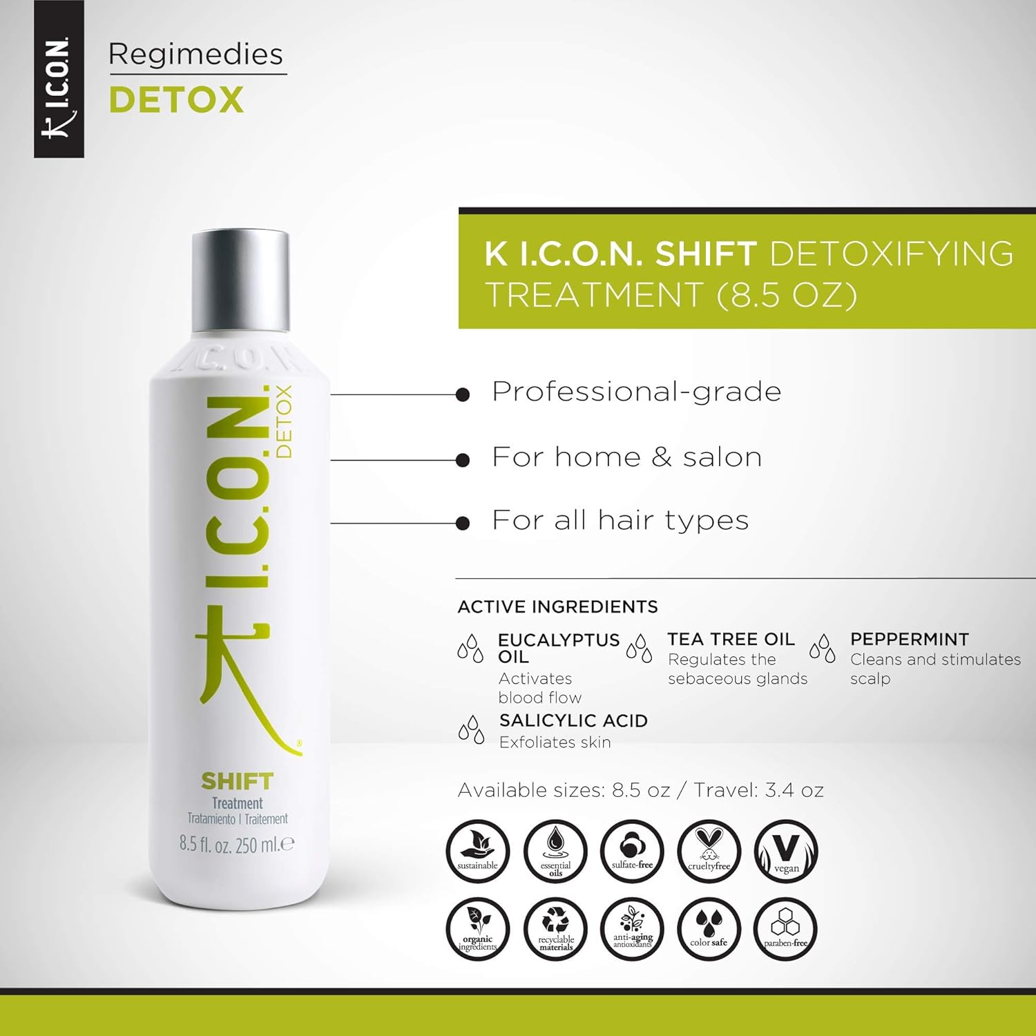 About this item HAIR-REPAIR TREATMENT: This exfoliating treatment for your scalp increases blood flow, reduces breakage, and eliminates buildup for strong, healthy hair. It detoxifies and deep cleans all hair types. AUTHENTIC K I.C.O.N.: This high-quality product is used at salons. You can trust the quality and efficacy of the Shift Detoxifying Treatment to care for your hair and to help it stay strong and healthy. RESTORATIVE INGREDIENTS: Get ready to feel a tingle. Our trio of peppermint, tea tree, and eucalyptus oils combined with salicylic acid work to stimulate, exfoliate, and regulate your scalp. DETOX HAIR TREATMENT: This product can be used on wet or dry hair. Apply to the scalp and work to the ends of your hair. Massage your scalp for 5–10 minutes, then follow with Energy shampoo and Awake conditioner. TRUSTED BRAND: K I.C.O.N. is committed to using natural, vegan, and cruelty-free ingredients that restore your hair to gorgeous condition. That means healthy shine, strength, and body no matter what style. See more product details,HAIR-REPAIR TREATMENT: This exfoliating treatment for your scalp increases blood flow, reduces breakage, and eliminates buildup for strong, healthy hair. It detoxifies and deep cleans all hair types,AUTHENTIC K I.C.O.N.: This high-quality product is used at salons. You can trust the quality and efficacy of the Shift Detoxifying Treatment to care for your hair and to help it stay strong and healthy,RESTORATIVE INGREDIENTS: Get ready to feel a tingle. Our trio of peppermint, tea tree, and eucalyptus oils combined with salicylic acid work to stimulate, exfoliate, and regulate your scalp,DETOX HAIR TREATMENT: This product can be used on wet or dry hair. Apply to the scalp and work to the ends of your hair. Massage your scalp for 5–10 minutes, then follow with Energy shampoo and Awake conditioner,TRUSTED BRAND: K I.C.O.N. is committed to using natural, vegan, and cruelty-free ingredients that restore your hair to gorgeous condition. That means healthy shine, strength, and body no matter what style